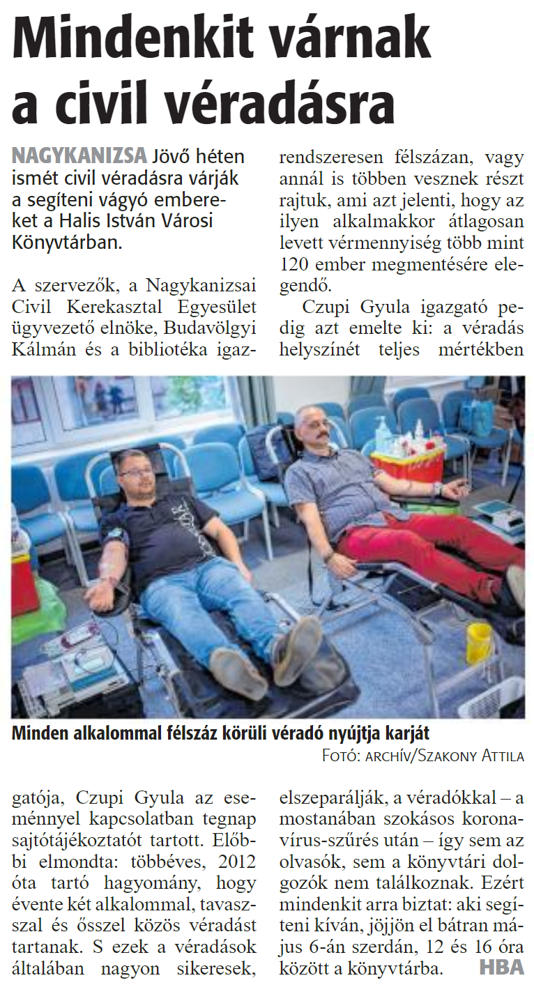 Nyilvános 1838 | 2657 | Zalai Hírlap 2020. április 29. 100. szám 3. oldal | Mindenkit várnak a civil véradásra NAGYKANIZSA Jövő héten ismét civil véradásra várják a segíteni vágyó embereket a Halis István Városi Könyvtárban. A szervezők, a Nagykanizsai Civil Kerekasztal Egyesület ügyvezető elnöke, Budavölgyi Kálmán és a bibliotéka igazgatója, Czupi Gyula az eseménnyel kapcsolatban tegnap sajtótájékoztatót tartott. Előbbi elmondta: többéves, 2012 óta tartó hagyomány, hogy évente két alkalommal, tavasszal és ősszel közös véradást tartanak. S ezek a véradások általában nagyon sikeresek, rendszeresen félszázán, vagy annál is többen vesznek részt rajtuk, ami azt jelenti, hogy az ilyen alkalmakkor átlagosan levett vérmennyiség több mint 120 ember megmentésére elegendő. Czupi Gyula igazgató pedig azt emelte ki: a véradás helyszínét teljes mértékben elszeparálják, a véradókkal - a mostanában szokásos koronavírus-szűrés után - így sem az olvasók, sem a könyvtári dolgozók nem találkoznak. Ezért mindenkit arra biztat: aki segíteni kíván, jöjjön el bátran május 6-án szerdán, 12 és 16 óra között a könyvtárba. HBA Minden alkalommal félszáz körüli véradó nyújtja karját Fotó: archív/Szakony Attila |