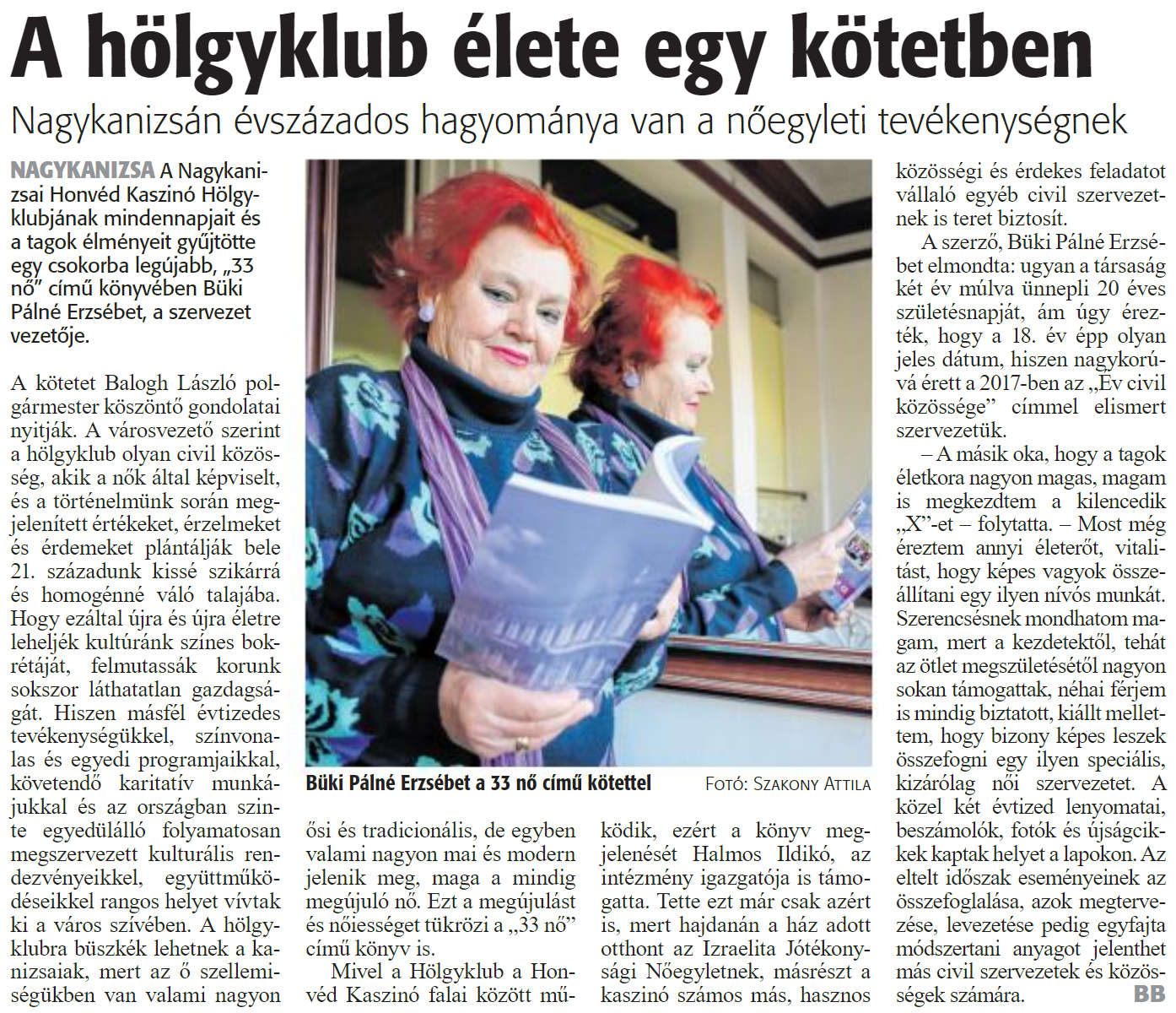 Nyilvános 1669 | 1971 | Zalai Hírlap 2020. május 6. 105. szám 13. oldal | A hölgyklub élete egy kötetben Nagykanizsán évszázados hagyománya van a nőegyleti tevékenységnek Büki Pálné Erzsébet a 33 nő című kötettel Fotó: Szakony Attila NAGYKANIZSA A Nagykanizsai Honvéd Kaszinó Hölgyklubjának mindennapjait és a tagok élményeit gyűjtötte egy csokorba legújabb, „33 nő" című könyvében Büki Pálné Erzsébet, a szervezet vezetője. A kötetet Balogh László polgármester köszöntő gondolatai nyitják. A városvezető szerint a hölgyklub olyan civil közösség, akik a nők által képviselt, és a történelmünk során megjelenített értékeket, érzelmeket és érdemeket plántálják bele 21. századunk kissé szikárrá és homogénné váló talajába. Hogy ezáltal újra és újra életre leheljék kultúránk színes bokrétáját, felmutassák korunk sokszor láthatatlan gazdagságát. Hiszen másfél évtizedes tevékenységükkel, színvonalas és egyedi programjaikkal, követendő karitatív munkájukkal és az országban szinte egyedülálló folyamatosan megszervezett kulturális rendezvényeikkel együttműködéseikkel rangos helyet vívtak ki a város szívében. A hölgyklubra büszkék lehetnek a kanizsaiak, mert az ő szellemiségükben van valami nagyon ősi és tradicionális, de egyben valami nagyon mai és modern jelenik meg, maga a mindig megújuló nő. Ezt a megújulást és nőiességet tükrözi a „33 nő" című könyv is. Mivel a Hölgyklub a Honvéd Kaszinó falai között működik, ezért a könyv megjelenését Halmos Ildikó, az intézmény igazgatója is támogatta. Tette ezt már csak azért is, mert hajdanán a ház adott otthont az Izraelita Jótékonysági Nőegyletnek, másrészt a kaszinó számos más, hasznos közösségi és érdekes feladatot vállaló egyéb civil szervezetnek is teret biztosít. A szerző. Büki Pálné Erzsébet elmondta: ugyan a társaság két év múlva ünnepli 20 éves születésnapját, ám úgy érezték, hogy a 18. év épp olyan jeles dátum, hiszen nagykorúvá érett a 2017-ben az „Év civil közössége" címmel elismert szervezetük. - A másik oka. hogy a tagok életkora nagyon magas, magam is megkezdtem a kilencedik „X"-et - folytatta. - Most még éreztem annyi életerőt, vitalitást, hogy képes vagyok összeállítani egy ilyen nívós munkát. Szerencsésnek mondhatom magam, mert a kezdetektől, tehát az ötlet megszületésétől nagyon sokan támogattak, néhai férjem is mindig biztatott, kiállt mellettem, hogy bizony képes leszek összefogni egy ilyen speciális, kizárólag női szervezetet. A közel két évtized lenyomatai, beszámolók, fotók és újságcikkek kaptak helyet a lapokon. Az eltelt időszak eseményeinek az összefoglalása, azok megtervezése, levezetése pedig egyfajta módszertani anyagot jelenthet más civil szervezetek és közösségek számára. BB |