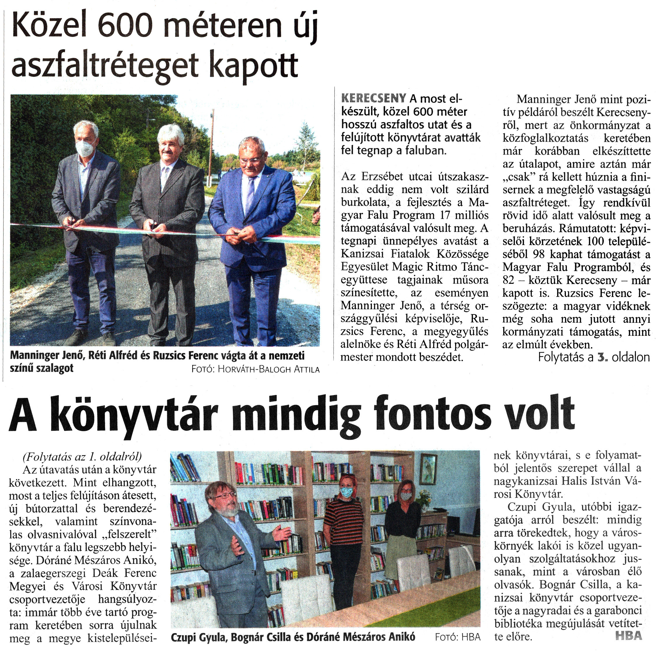 Nyilvános 1795 | 2302 | Zalai Hírlap 2020. szeptember 19. 220. szám 1, 3. oldal | Közel 600 méteren új aszfaltréteget kapott KERECSENY A most elkészült, közel 600 méter hosszú aszfaltos utat és a felújított könyvtárat avatták fel tegnap a faluban. Az Erzsébet utcai útszakasznak eddig nem volt szilárd burkolata, a fejlesztés a Magyar Falu Program 17 milliós támogatásával valósult meg. A tegnapi ünnepélyes avatást a Kanizsai Fiatalok Közössége Egyesület Magic Ritmo Táncegyüttese tagjainak műsora színesítette, az eseményen Manninger Jenő, a térség országgyűlési képviselője, Ruzsics Ferenc, a megyegyülés alelnöke és Réti Alfréd polgármester mondott beszédet. Manninger Jenő mint pozitív példáról beszélt Kerecsenyről, mert az önkormányzat a közfoglalkoztatás keretében már korábban elkészíttette az útalapot, amire aztán már „csak" rá kellett húznia a finisernek a megfelelő vastagságú aszfaltréteget. így rendkívül rövid idő alatt valósult meg a beruházás. Rámutatott: képviselői körzetének 100 településéből 98 kaphat támogatást a Magyar Falu Programból, és 82 - köztük Kerecseny - már kapott is. Ruzsics Ferenc leszögezte: a magyar vidéknek még soha nem jutott annyi kormányzati támogatás, mint az elmúlt években. Folytatás a 3. oldalon A könyvtár mindig fontos volt (Folytatás az 1. oldalról) Az útavatás után a könyvtár következett. Mint elhangzott, most a teljes felújításon átesett, új bútorzattal és berendezésekkel, valamint színvonalas olvasnivalóval „felszerelt" könyvtár a falu legszebb helyisége. Dóráné Mészáros Anikó, a zalaegerszegi Deák Ferenc Megyei és Városi Könyvtár csoportvezetője hangsúlyozta: immár több éve tartó program keretében sorra újulnak meg a megye kistelepüléseinek könyvtárai, s e folyamatból jelentős szerepet vállal a nagykanizsai Halis István Városi Könyvtár. Czupi Gyula, utóbbi igazgatója arról beszélt: mindig arra törekedtek, hogy a városkörnyék lakói is közel ugyanolyan szolgáltatásokhoz jussanak, mint a városban élő olvasók. Bognár Csilla, a kanizsai könyvtár csoportvezetője a nagyradai és a garabonci bibliotéka megújulását vetítette előre. HBA Manninger Jenő, Réti Alfréd és Ruzsics Ferenc vágta át a nemzeti színű szalagot Fotó: Horváth-Balogh Attila Czupi Gyula, Bognár Csilla és Dóráné Mészáros Anikó Fotó: HBA |