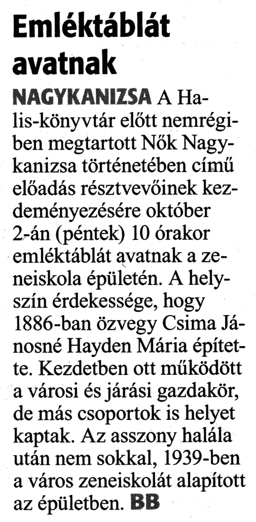 Nyilvános 1778 | 2313 | Zalai Hírlap 2020. szeptember 30. 229. szám 3. oldal | Emléktáblát avatnak NAGYKANIZSA A Halis-könyvtár előtt nemrégiben megtartott Nők Nagykanizsa történetében című előadás résztvevőinek kezdeményezésére október 2-án (péntek) 10 órakor emléktáblát avatnak a zeneiskola épületén. A helyszín érdekessége, hogy 1886-ban özvegy Csima Jánosné Hayden Mária építette. Kezdetben ott működött a városi és járási gazdakör, de más csoportok is helyet kaptak. Az asszony halála után nem sokkal, 1939-ben a város zeneiskolát alapított az épületben. BB |