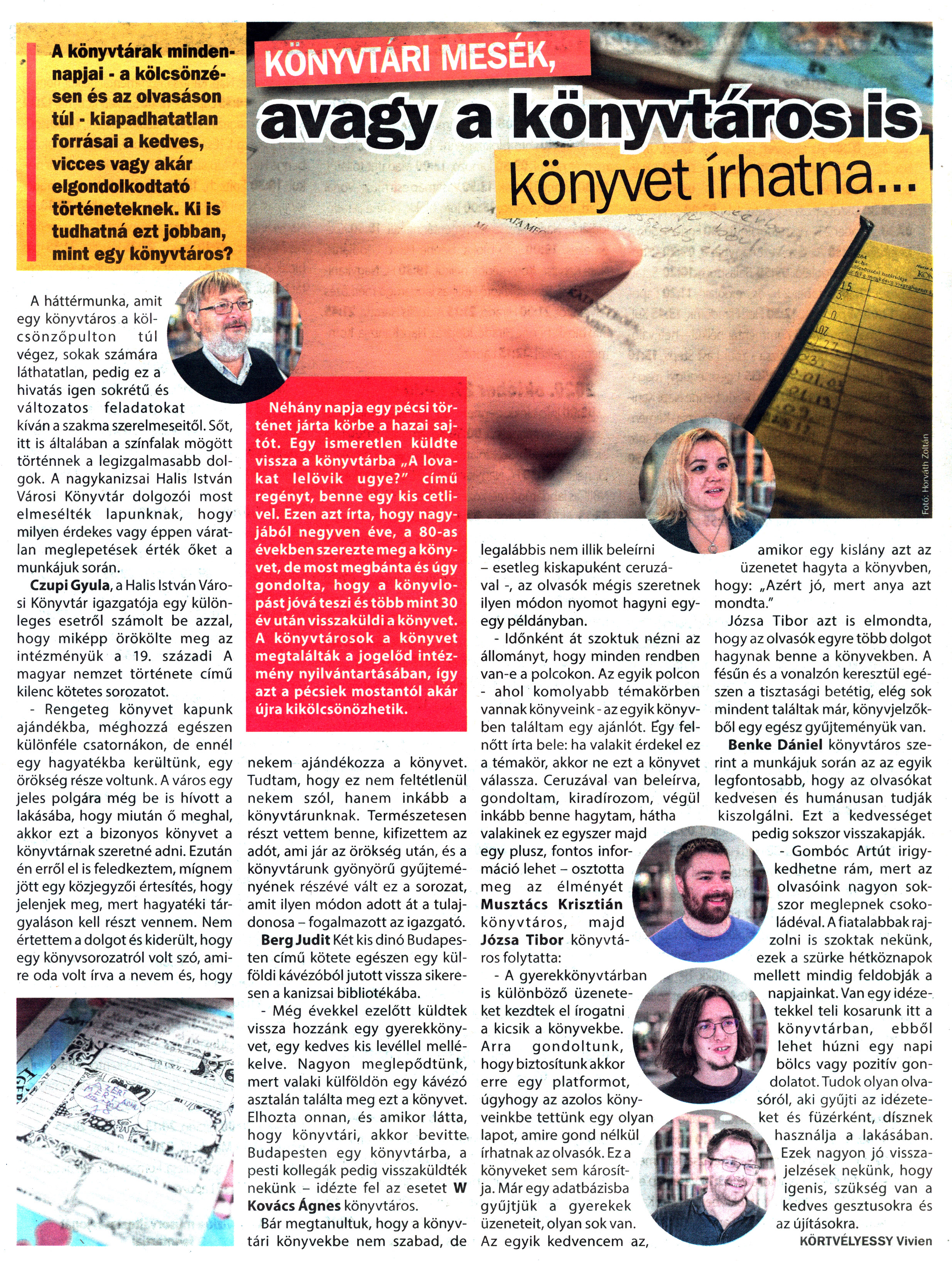 Nyilvános 1934 | 2796 | Kanizsa 2020. október 24. 38. szám 19old - Könyvtári mesék | KÖNYVTÁRI MESÉK, avagy a könyvtáros is könyvet írhatna... A könyvtárak mindennapjai - a kölcsönzésen és az olvasáson túl - kiapadhatatlan forrásai a kedves, vicces vagy akár elgondolkodtató történeteknek. Ki is tudhatná ezt jobban, mint egy könyvtáros? Nehany napja egy pécsi történet járta körbe a hazai sajtót. Egy ismeretlen küldte vissza a könyvtárba „A lovakat lelövik ugye?" című regényt, benne egy kis cetlivel. Ezen azt írta, hogy nagyjából negyven éve, a 80-as években szerezte meg a könyvet, de most megbánta és úgy gondolta, hogy a könyvlopást jóvá teszi és több mint 30 év után visszaküldi a könyvet. A könyvtárosok a könyvet megtalálták a jogelőd intézmény nyilvántartásában, így azt a pécsiek mostantól akár újra kikölcsönözhetik. A háttérmunka, amit egy könyvtáros a kölcsönzőpulton túl végez, sokak számára láthatatlan, pedig ez a hivatás igen sokrétű és változatos feladatokat kíván a szakma szerelmeseitől. Sőt, itt is általában a színfalak mögött történnek a legizgalmasabb dolgok. A nagykanizsai Halis István Városi Könyvtár dolgozói most elmesélték lapunknak, hogy milyen érdekes vagy éppen váratlan meglepetések érték őket a munkájuk során. Czupi Gyula, a Halis István Városi Könyvtár igazgatója egy különleges esetről számolt be azzal, hogy miképp örökölte meg az intézményük a 19. századi A magyar nemzet története című kilenc kötetes sorozatot. - Rengeteg könyvet kapunk ajándékba, méghozzá egészen különféle csatornákon, de ennél egy hagyatékba kerültünk, egy örökség része voltunk. A város egy jeles polgára még be is hívott a lakásába, hogy miután ő meghal, akkor ezt a bizonyos könyvet a könyvtárnak szeretné adni. Ezután én erről el is feledkeztem, mígnem jött egy közjegyzői értesítés, hogy jelenjek meg, mert hagyatéki tárgyaláson kell részt vennem. Nem értettem a dolgot és kiderült, hogy egy könyvsorozatról volt szó, amire oda volt írva a nevem és, hogy nekem ajándékozza a könyvet. Tudtam, hogy ez nem feltétlenül nekem szól, hanem inkább a könyvtárunknak. Természetesen részt vettem benne, kifizettem az adót, ami jár az örökség után, és a könyvtárunk gyönyörű gyűjteményének részévé vált ez a sorozat, amit ilyen módon adott át a tulajdonosa - fogalmazott az igazgató. Berg Judit Két kis dinó Budapesten című kötete egészen egy külföldi kávézóból jutott vissza sikeresen a kanizsai bibliotékába. - Még évekkel ezelőtt küldtek vissza hozzánk egy gyerekkönyvet, egy kedves kis levéllel mellékelve. Nagyon meglepődtünk, mert valaki külföldön egy kávézó asztalán találta meg ezt a könyvet. Elhozta onnan, és amikor látta, hogy könyvtári, akkor bevitte Budapesten egy könyvtárba, a pesti kollegák pedig visszaküldték nekünk - idézte fel az esetet W Kovács Ágnes könyvtáros. Bár megtanultuk, hogy a könyvtári könyvekbe nem szabad, de legalábbis nem illik beleírni - esetleg kiskapuként ceruzával -, az olvasók mégis szeretnek ilyen módon nyomot hagyni egy-egy példányban. - Időnként át szoktuk nézni az állományt, hogy minden rendben van-e a polcokon. Az egyik polcon - ahol komolyabb témakörben vannak könyveink - az egyik könyvben találtam egy ajánlót. Egy felnőtt írta bele: ha valakit érdekel ez a témakör, akkor ne ezt a könyvet válassza. Ceruzával van beleírva, gondoltam, kiradírozom, végül inkább benne hagytam, hátha valakinek ez egyszer majd egy plusz, fontos információ lehet - osztotta meg az élményét Musztács Krisztián könyvtáros, majd Józsa Tibor könyvtáros folytatta: - A gyerekkönyvtárban is különböző üzeneteket kezdtek el írogatni a kicsik a könyvekbe. Arra gondoltunk, hogy biztosítunk akkor erre egy platformot, úgyhogy az azolos könyveinkbe tettünk egy olyan lapot, amire gond nélkül írhatnak az olvasók. Ez a könyveket sem károsítja. Már egy adatbázisba gyűjtjük a gyerekek üzeneteit, olyan sok van. Az egyik kedvencem az, amikor egy kislány azt az üzenetet hagyta a könyvben, hogy: „Azért jó, mert anya azt mondta." Józsa Tibor azt is elmondta, hogy az olvasók egyre több dolgot hagynak benne a könyvekben. A fésűn és a vonalzón keresztül egészen a tisztasági betétig, elég sok mindent találtak már, könyvjelzőkből egy egész gyűjteményük van. Benke Dániel könyvtáros szerint a munkájuk során az az egyik legfontosabb, hogy az olvasókat kedvesen és humánusan tudják kiszolgálni. Ezt a kedvességet pedig sokszor visszakapják. - Gombóc Artút irigykedhetne rám, mert az olvasóink nagyon sokszor meglepnek csokoládéval. A fiatalabbak rajzolni is szoktak nekünk, ezek a szürke hétköznapok mellett mindig feldobják a napjainkat. Van egy idézetekkel teli kosarunk itt a könyvtárban, ebből lehet húzni egy napi bölcs vagy pozitív gondolatot. Tudok olyan olvasóról, aki gyűjti az idézeteket és füzérként, dísznek használja a lakásában. Ezek nagyon jó visszajelzések nekünk, hogy igenis, szükség van a kedves gesztusokra és az újításokra. KÖRTVÉLYESSY Vivien |