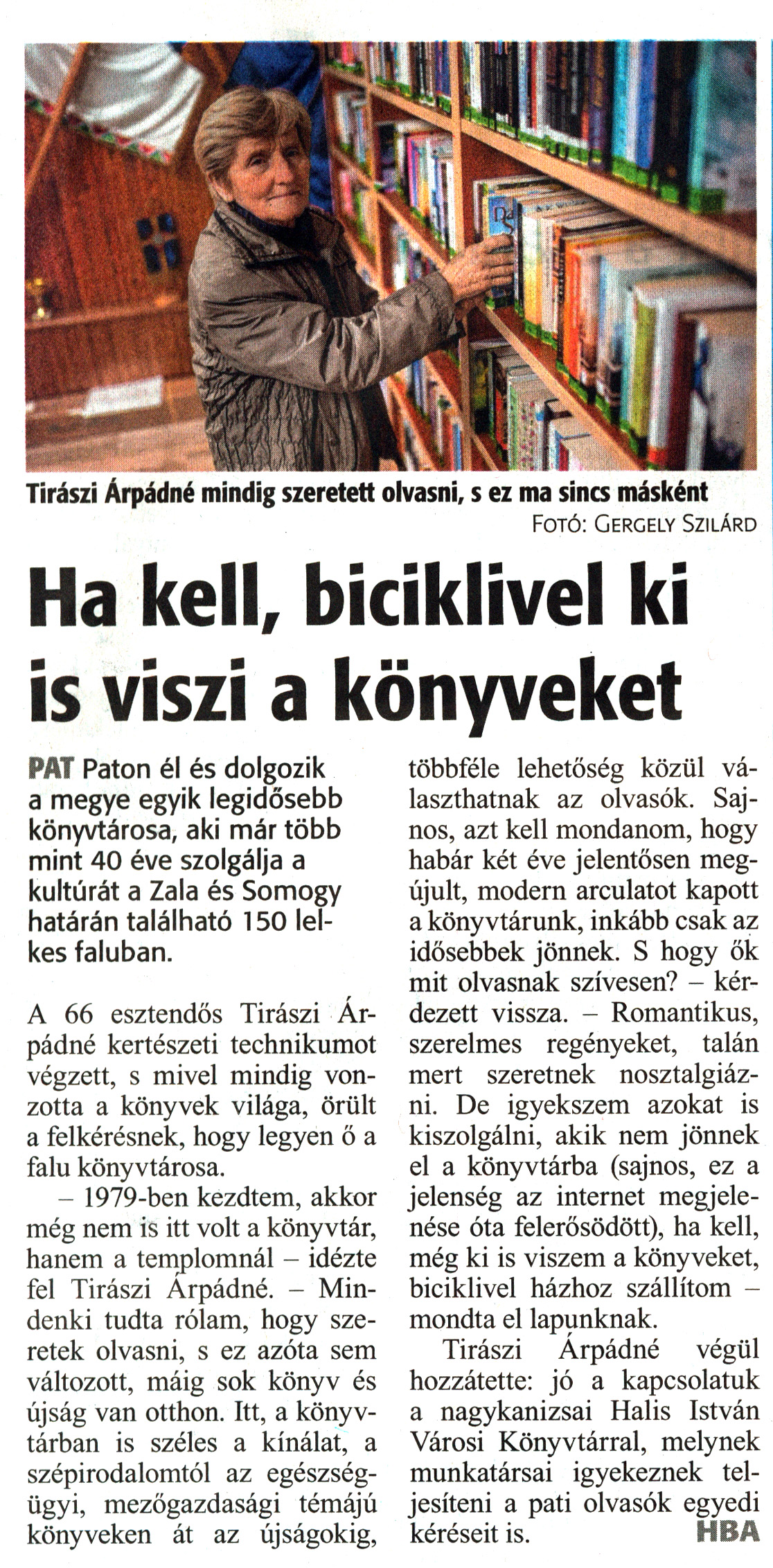 Nyilvános 1702 | 2135 | Zalai Hírlap 2020. december 28. 302. szám 5. oldal | Fotó: Gergely Szilárd Ha kell, biciklivel ki is viszi a könyveket Tirászi Árpádné mindig szeretett olvasni, s ez ma sincs másként PAT Paton él és dolgozik a megye egyik legidősebb könyvtárosa, aki már több mint 40 éve szolgálja a kultúrát a Zala és Somogy határán található 150 lelkes faluban. A 66 esztendős Tirászi Árpádné kertészeti technikumot végzett, s mivel mindig vonzotta a könyvek világa, örült a felkérésnek, hogy legyen ő a falu könyvtárosa. - 1979-ben kezdtem, akkor még nem is itt volt a könyvtár, hanem a templomnál - idézte fel Tirászi Arpádné. - Mindenki tudta rólam, hogy szeretek olvasni, s ez azóta sem változott, máig sok könyv és újság van otthon. Itt, a könyvtárban is széles a kínálat, a szépirodalomtól az egészségügyi, mezőgazdasági témájú könyveken át az újságokig, többféle lehetőség közül választhatnak az olvasók. Sajnos, azt kell mondanom, hogy habár két éve jelentősen megújult, modern arculatot kapott a könyvtárunk, inkább csak az idősebbek jönnek. S hogy ők mit olvasnak szívesen? - kérdezett vissza. - Romantikus, szerelmes regényeket, talán mert szeretnek nosztalgiázni. De igyekszem azokat is kiszolgálni, akik nem jönnek el a könyvtárba (sajnos, ez a jelenség az internet megjelenése óta felerősödött), ha kell, még ki is viszem a könyveket, biciklivel házhoz szállítom - mondta el lapunknak. Tirászi Arpádné végül hozzátette: jó a kapcsolatuk a nagykanizsai Halis István Városi Könyvtárral, melynek munkatársai igyekeznek teljesíteni a pati olvasók egyedi kéréseit is. HBA |