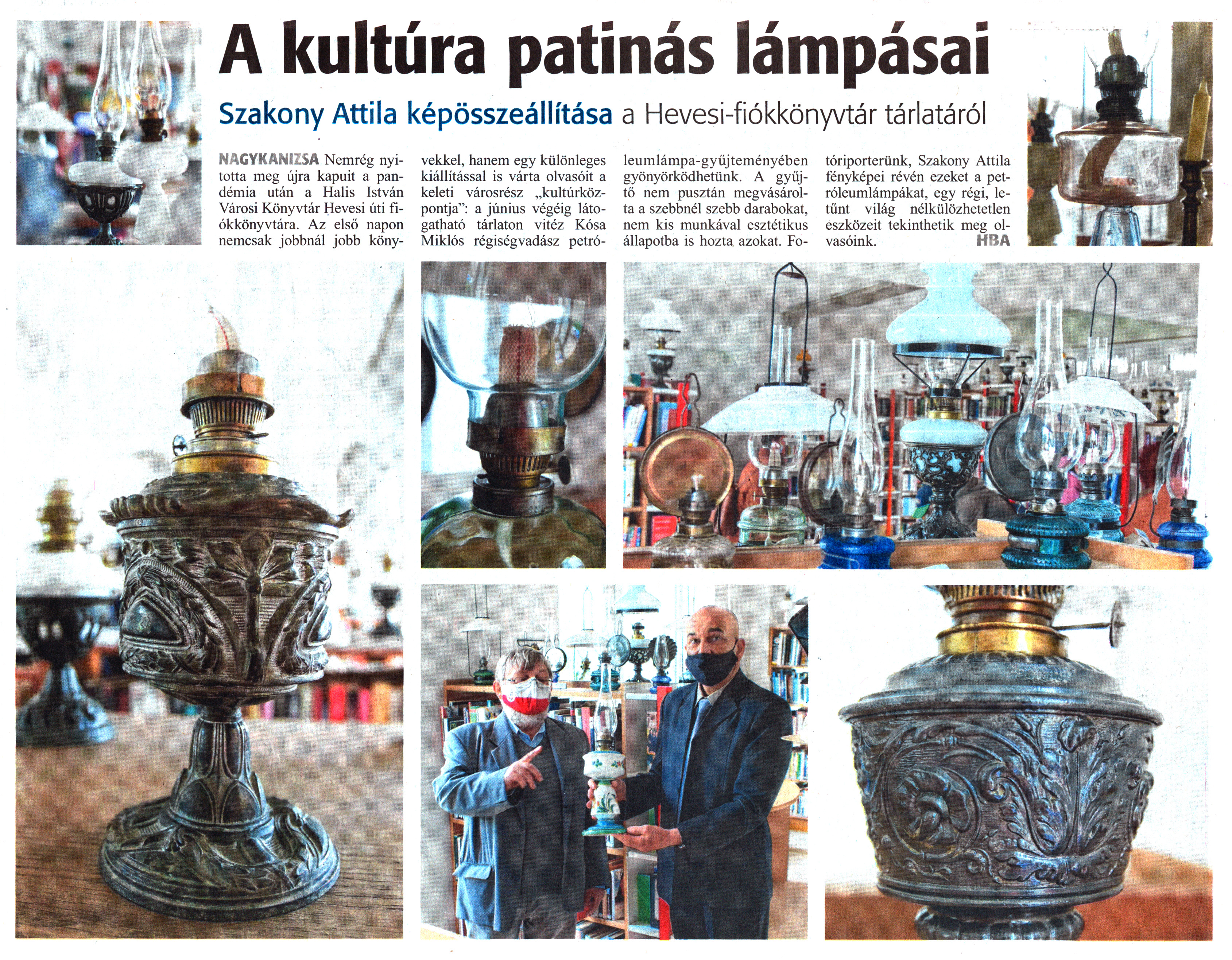 Nyilvános 1637 | 2369 | Zalai Hírlap 2021. május 26. 119. szám 5. oldal | A kultúra patinás lámpásai Szakony Attila képösszeállítása a Hevesi-fiókkönyvtár tárlatáról NAGYKANIZSA Nemrég nyitotta meg újra kapuit a pandémia után a Halis István Városi Könyvtár Hevesi úti fiókkönyvtára. Az első napon nemcsak jobbnál jobb könyvekkel, hanem egy különleges kiállítással is várta olvasóit a keleti városrész „kultúrközpontja": a június végéig látogatható tárlaton vitéz Kósa Miklós régiségvadász petróleumlámpa-gyűjteményében gyönyörködhetünk. A gyűjtő nem pusztán megvásárolta a szebbnél szebb darabokat, nem kis munkával esztétikus állapotba is hozta azokat. Fotóriporterünk, Szakony Attila fényképei révén ezeket a petróleumlámpákat, egy régi, letűnt világ nélkülözhetetlen eszközeit tekinthetik meg olvasóink. HBA |