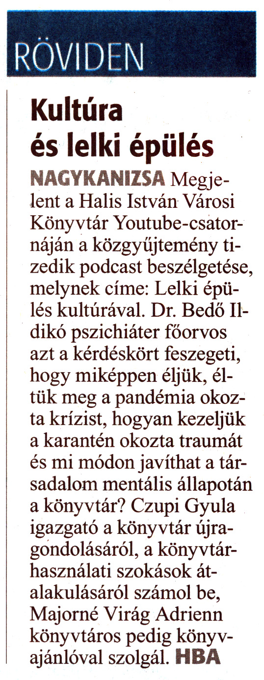 Nyilvános 1582 | 2152 | Zalai Hírlap 2021. június 1. 124. szám 3. oldal | RÖVIDEN Kultúra és lelki épülés NAGYKANIZSA Megjelent a Halis István Városi Könyvtár Youtube-csatornáján a közgyűjtemény tizedik podcast beszélgetése, melynek címe: Lelki épülés kultúrával. Dr. Bedő Ildikó pszichiáter főorvos azt a kérdéskört feszegeti, hogy miképpen éljük, éltük meg a pandémia okozta krízist, hogyan kezeljük a karantén okozta traumát és mi módon javíthat a társadalom mentális állapotán a könyvtár? Czupi Gyula igazgató a könyvtár újragondolásáról, a könyvtárhasználati szokások átalakulásáról számol be, Majomé Virág Adrienn könyvtáros pedig könyvajánlóval szolgál. HBA |