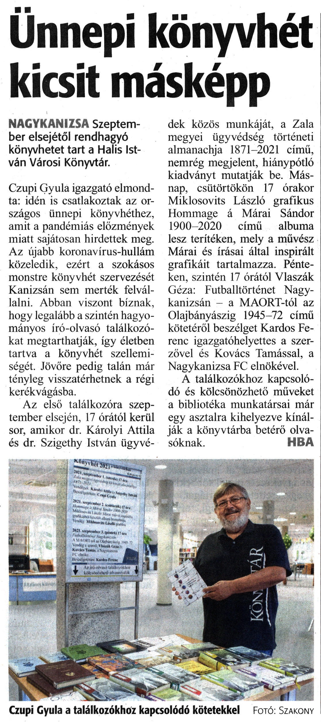 Nyilvános 1527 | 1914 | Zalai Hírlap 2021. augusztus 27. 198. szám 3. oldal | Ünnepi könyvhét kicsit másképp NAGYKANIZSA Szeptember elsejétől rendhagyó könyvhetet tart a Halis István Városi Könyvtár. Czupi Gyula igazgató elmondta: idén is csatlakoztak az országos ünnepi könyvhéthez, amit a pandémiás előzmények miatt sajátosan hirdettek meg. Az újabb koronavírus-hullám közeledik, ezért a szokásos monstre könyvhét szervezését Kanizsán sem merték felvállalni. Abban viszont bíznak, hogy legalább a szintén hagyományos író-olvasó találkozókat megtarthatják, így életben tartva a könyvhét szellemiségét. Jövőre pedig talán már tényleg visszatérhetnek a régi kerékvágásba. Az első találkozóra szeptember elsején, 17 órától kerül sor, amikor dr. Károlyi Attila és dr. Szigethy István ügyvédek közös munkáját, a Zala megyei ügyvédség történeti almanachja 1871-2021 című, nemrég megjelent, hiánypótló kiadványt mutatják be. Másnap, csütörtökön 17 órakor Miklosovits László grafikus Hommage á Márai Sándor 1900-2020 című albuma lesz terítéken, mely a művész Márai és írásai által inspirált grafikáit tartalmazza. Pénteken, szintén 17 órától Vlaszák Géza: Futballtörténet Nagykanizsán - a MAORT-tól az Olajbányászig 1945-72 című kötetéről beszélget Kardos Ferenc igazgatóhelyettes a szerzővel és Kovács Tamással, a Nagykanizsa FC elnökével. A találkozókhoz kapcsolódó és kölcsönözhető műveket a bibliotéka munkatársai már egy asztalra kihelyezve kínálják a könyvtárba betérő olvasóknak. HBA Czupi Gyula a találkozókhoz kapcsolódó kötetekkel Fotó: Szakony |