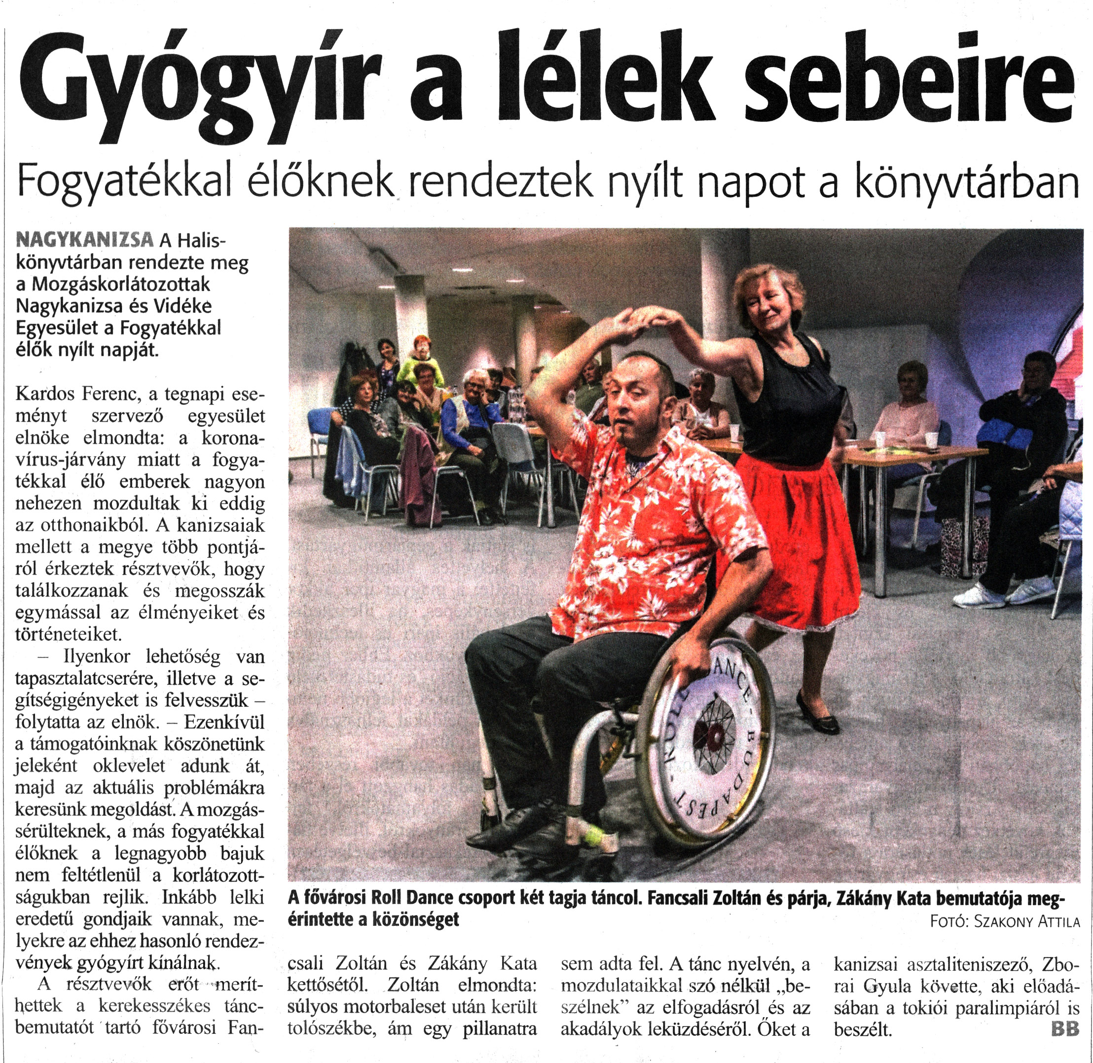 Nyilvános 1584 | 2080 | Zalai Hírlap 2021. október 8. 234. szám 1. oldal | Gyógyír a lélek sebeire Fogyatékkal élőknek rendeztek nyílt napot a könyvtárban NAGYKANIZSA A Halis-könyvtárban rendezte meg a Mozgáskorlátozottak Nagykanizsa és Vidéke Egyesület a Fogyatékkal élők nyílt napját. Kardos Ferenc, a tegnapi eseményt szervező egyesület elnöke elmondta: a koronavírus-járvány miatt a fogyatékkal élő emberek nagyon nehezen mozdultak ki eddig az otthonaikból. A kanizsaiak mellett a megye több pontjáról érkeztek résztvevők, hogy találkozzanak és megosszák egymással az élményeiket és történeteiket. - Ilyenkor lehetőség van tapasztalatcserére, illetve a segítségigényeket is felvesszük -folytatta az elnök. - Ezenkívül a támogatóinknak köszönetünk jeleként oklevelet adunk át, majd az aktuális problémákra keresünk megoldást. A mozgássérülteknek, a más fogyatékkal élőknek a legnagyobb bajuk nem feltétlenül a korlátozottságukban rejlik. Inkább lelki eredetű gondjaik vannak, melyekre az ehhez hasonló rendezvények gyógyírt kínálnak. A résztvevők erőt meríthettek a kerekesszékes táncbemutatót tartó íövárosi Fancsali Zoltán és Zákány Kata kettősétől. Zoltán elmondta: súlyos motorbaleset után került tolószékbe, ám egy pillanatra sem adta fel. A tánc nyelvén, a mozdulataikkal szó nélkül „beszélnek" az elfogadásról és az akadályok leküzdéséről. Őket a kanizsai asztaliteniszező, Zborai Gyula követte, aki előadásában a tokiói paralimpiáról is beszélt. BB A fővárosi Roll Dance csoport két tagja táncol. Fancsali Zoltán és párja. Zákány Kata bemutatója megérintette a közönséget Fotó: Szakony Attila |