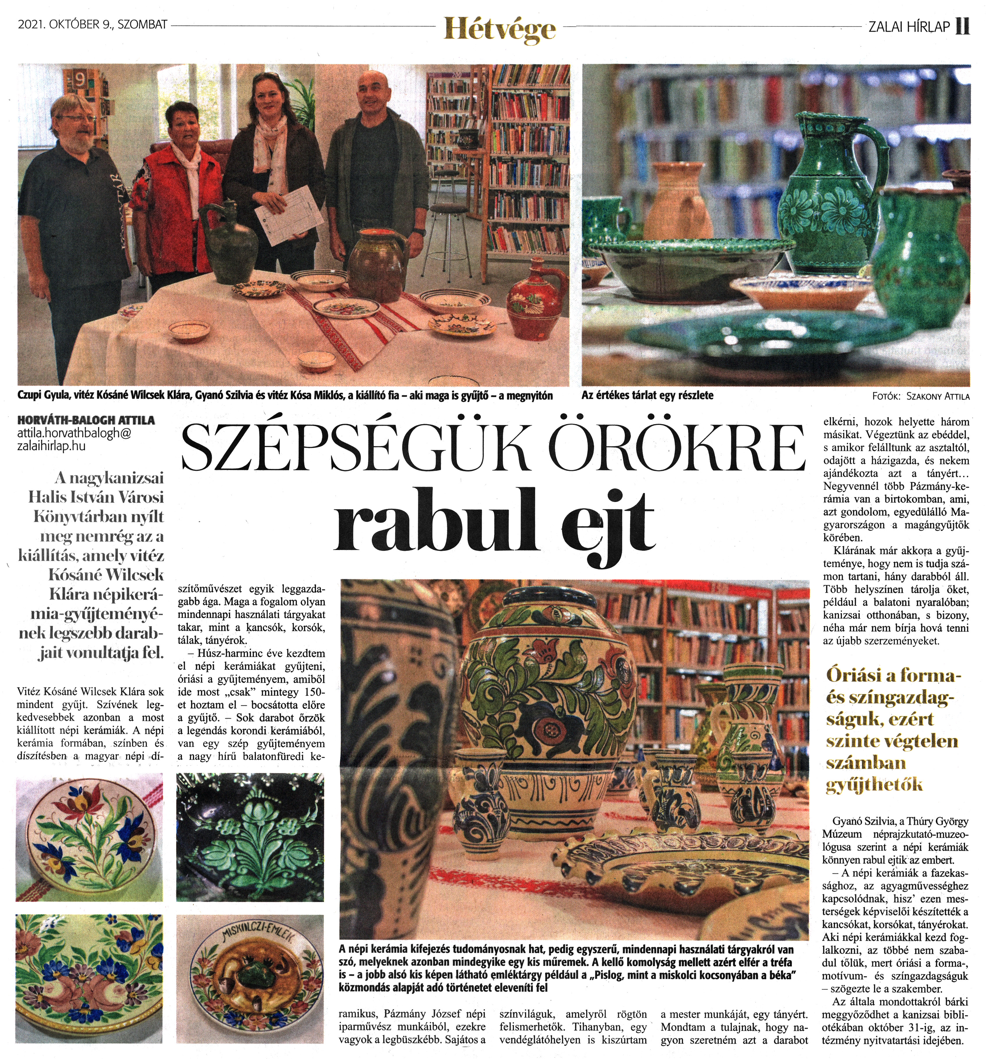 Nyilvános 1612 | 2302 | Zalai Hírlap 2021. október 9. 235. szám 11. oldal | SZÉPSÉGÜK ÖRÖKRE rabul ejt HORVÁTH-BALOGH ATTILA attila.horvathbalogh@zalaihirlap.hu A nagykanizsai Halis István Városi Könyvtárban nyílt meg nemrég az a kiállítás, amely vitéz Kósáné Wilcsek Klára népikerámia-gyűjteményének legszebb darabjait vonultatja lel. Vitéz Kósáné Wilcsek Klára sok mindent gyűjt. Szívének legkedvesebbek azonban a most kiállított népi kerámiák. A népi kerámia formában, színben és díszítésben a magyar népi díszítőművészet egyik leggazdagabb ága. Maga a fogalom olyan mindennapi használati tárgyakat takar, mint a kancsók, korsók, tálak, tányérok. - Húsz-harminc éve kezdtem el népi kerámiákat gyűjteni, óriási a gyűjteményem, amiből ide most „csak" mintegy 150-et hoztam el - bocsátotta előre a gyűjtő. - Sok darabot őrzök a legéndás korondi kerámiából, van egy szép gyűjteményem a nagy hírű balatonfüredi keramikus, Pázmány József népi iparművész munkáiból, ezekre vagyok a legbüszkébb. Sajátos a színviláguk, amelyről rögtön felismerhetők. Tihanyban, egy vendéglátóhelyen is kiszúrtam a mester munkáját, egy tányért. Mondtam a tulajnak, hogy nagyon szeretném azt a darabot elkérni, hozok helyette három másikat. Végeztünk az ebéddel, s amikor felálltunk az asztaltól, odajött a házigazda, és nekem ajándékozta azt a tányért... Negyvennél több Pázmány-kerámia van a birtokomban, ami, azt gondolom, egyedülálló Magyarországon a magángyűjtők körében. Klárának már akkora a gyűjteménye, hogy nem is tudja számon tartani, hány darabból áll. Több helyszínen tárolja őket, például a balatoni nyaralóban; kanizsai otthonában, s bizony, néha már nem bírja hová tenni az újabb szerzeményeket. Gyanó Szilvia, a Thúry György Múzeum néprajzkutató-muzeológusa szerint a népi kerámiák könnyen rabul ejtik az embert. - A népi kerámiák a fazekassághoz, az agyagművességhez kapcsolódnak, hisz'' ezen mesterségek képviselői készítették a kancsókat, korsókat, tányérokat. Aki népi kerámiákkal kezd foglalkozni, az többé nem szabadul tőlük, mert óriási a forma-, motívum- és színgazdagságuk - szögezte le a szakember. Az általa mondottakról bárki meggyőződhet a kanizsai bibliotékában október 31-ig, az intézmény nyitvatartási idejében. A népi kerámia kifejezés tudományosnak hat, pedig egyszerű, mindennapi használati tárgyakról van szó, melyeknek azonban mindegyike egy kis műremek. A kellő komolyság mellett azért elfér a tréfa is - a jobb alsó kis képen látható emléktárgy például a „Pislog, mint a miskolci kocsonyában a béka" közmondás alapját adó történetet eleveníti fel Az értékes tárlat egy részlete Czupi Gyula, vitéz Kósáné Wilcsek Klára, Gyanó Szilvia és vitéz Kósa Miklós, a kiállító fia - aki maga is gyűjtő - a megnyitón Fotók: Szakony Attila |