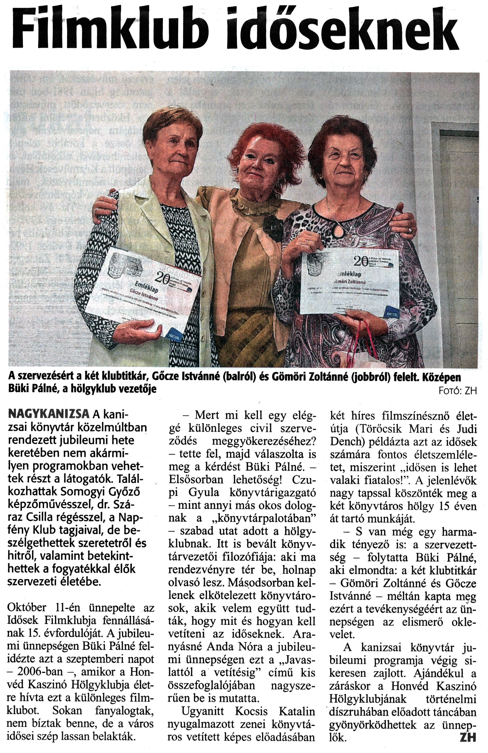 Nyilvános 1605 | 2056 | Zalai Hírlap 2021. október 15. 240. szám 12. oldal | Filmklub időseknek A szervezésért a két klubtitkár, Gőcze Istvánné (balról) és Gömöri Zoltánné (jobbról) felelt. Középen Büki Pálné, a hölgyklub vezetője Fotó: ZH NAGYKANIZSA A kanizsai könyvtár közelmúltban rendezett jubileumi hete keretében nem akármilyen programokban vehettek részt a látogatók. Találkozhattak Somogyi Győző képzőművésszel, dr. Száraz Csilla régésszel, a Napfény Klub tagjaival, de beszélgethettek szeretetről és hitről, valamint betekinthettek a fogyatékkal élők szervezeti életébe. Október 11-én ünnepelte az Idősek Filmklubja fennállásának 15. évfordulóját. A jubileumi ünnepségen Büki Pálné felidézte azt a szeptemberi napot - 2006-ban -, amikor a Honvéd Kaszinó Hölgyklubja életre hívta ezt a különleges filmklubot. Sokan fanyalogtak, nem bíztak benne, de a város idősei szép lassan belakták. - Mert mi kell egy eléggé különleges civil szerveződés meggyökerezéséhez? - tette fel, majd válaszolta is meg a kérdést Büki Pálné. - Elsősorban lehetőség! Czupi Gyula könyvtárigazgató - mint annyi más okos dolognak a „könyvtárpalotában" - szabad utat adott a hölgyklubnak. Itt is bevált könyvtárvezetői filozófiája: aki ma rendezvényre tér be, holnap olvasó lesz. Másodsorban kellenek elkötelezett könyvtárosok, akik velem együtt tudták, hogy mit és hogyan kell vetíteni az időseknek. Aranyásné Anda Nóra a jubileumi ünnepségen ezt a „Javaslattól a vetítésig" című kis összefoglalójában nagyszerűen be is mutatta. Ugyanitt Kocsis Katalin nyugalmazott zenei könyvtáros vetített képes előadásában két híres filmszínésznő életútja (Törőcsik Mari és Judi Dench) példázta azt az idősek számára fontos életszemléletet, miszerint „idősen is lehet valaki fiatalos!". A jelenlévők nagy tapssal köszönték meg a két könyvtáros hölgy 15 éven át tartó munkáját. - S van még egy harmadik tényező is: a szervezettség - folytatta Büki Pálné, aki elmondta: a két klubtitkár - Gömöri Zoltánné és Gőcze Istvánné - méltán kapta meg ezért a tevékenységéért az ünnepségen az elismerő oklevelet. A kanizsai könyvtár jubileumi programja végig sikeresen zajlott. Ajándékul a záráskor a Honvéd Kaszinó Hölgyklubjának történelmi díszruhában előadott táncában gyönyörködhettek az ünneplők. ZH |