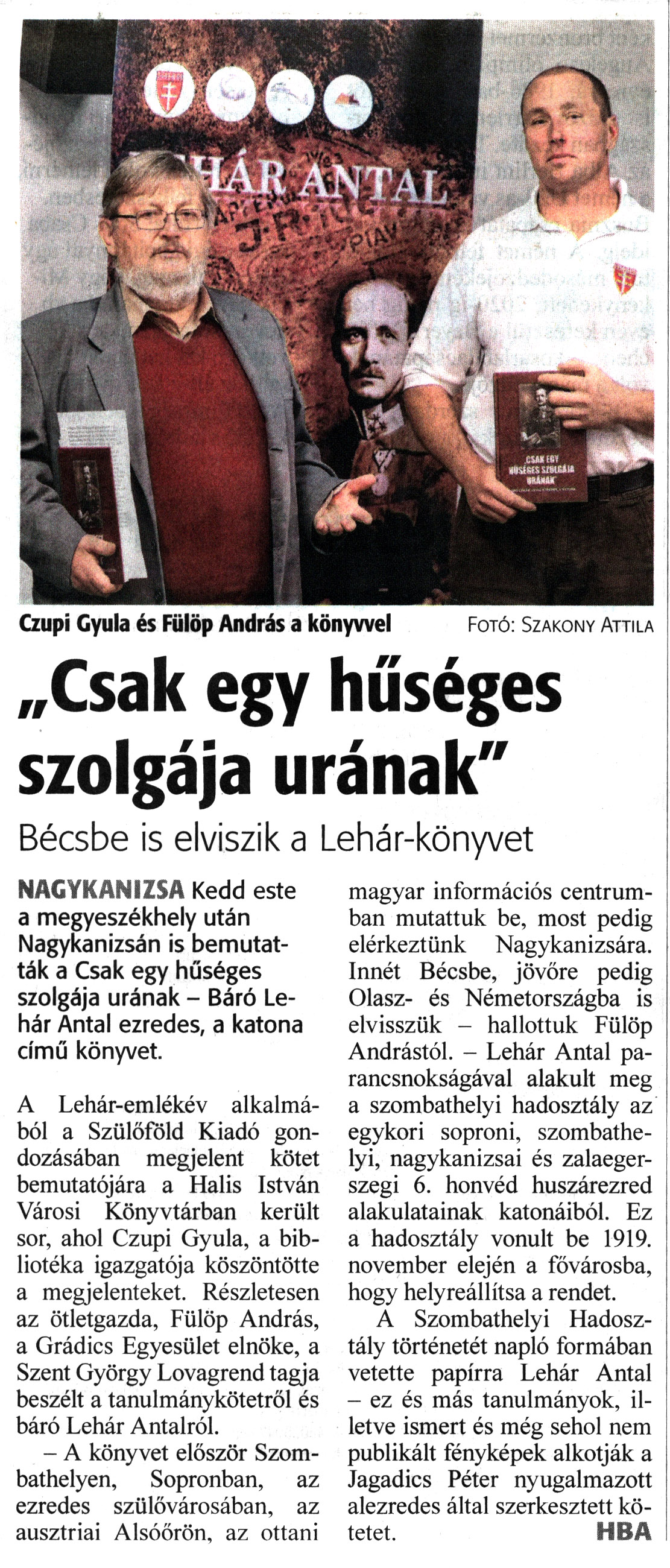 Nyilvános 1597 | 2103 | Zalai Hírlap 2021. november 25. 273. szám 16. oldal | „Csak egy hűséges szolgája urának" Bécsbe is elviszik a Lehár-könyvet NAGYKANIZSA Kedd este a megyeszékhely után Nagykanizsán is bemutatták a Csak egy hűséges szolgája urának - Báró Lehár Antal ezredes, a katona című könyvet. A Lehár-emlékév alkalmából a Szülőföld Kiadó gondozásában megjelent kötet bemutatójára a Halis István Városi Könyvtárban került sor, ahol Czupi Gyula, a bibliotéka igazgatója köszöntötte a megjelenteket. Részletesen az ötletgazda, Fülöp András, a Grádics Egyesület elnöke, a Szent György Lovagrend tagja beszélt a tanulmánykötetről és báró Lehár Antalról. - A könyvet először Szombathelyen, Sopronban, az ezredes szülővárosában, az ausztriai Alsóőrön, az ottani magyar információs centrumban mutattuk be, most pedig elérkeztünk Nagykanizsára. Innét Bécsbe, jövőre pedig Olasz- és Németországba is elvisszük - hallottuk Fülöp Andrástól. - Lehár Antal parancsnokságával alakult meg a szombathelyi hadosztály az egykori soproni, szombathelyi, nagykanizsai és zalaegerszegi 6. honvéd huszárezred alakulatainak katonáiból. Ez a hadosztály vonult be 1919. november elején a fővárosba, hogy helyreállítsa a rendet. A Szombathelyi Hadosztály történetét napló formában vetette papírra Lehár Antal - ez és más tanulmányok, illetve ismert és még sehol nem publikált fényképek alkotják a Jagadics Péter nyugalmazott alezredes által szerkesztett kötetet. HBA Czupi Gyula és Fülöp András a könyvvel Fotó: Szakony Attila |