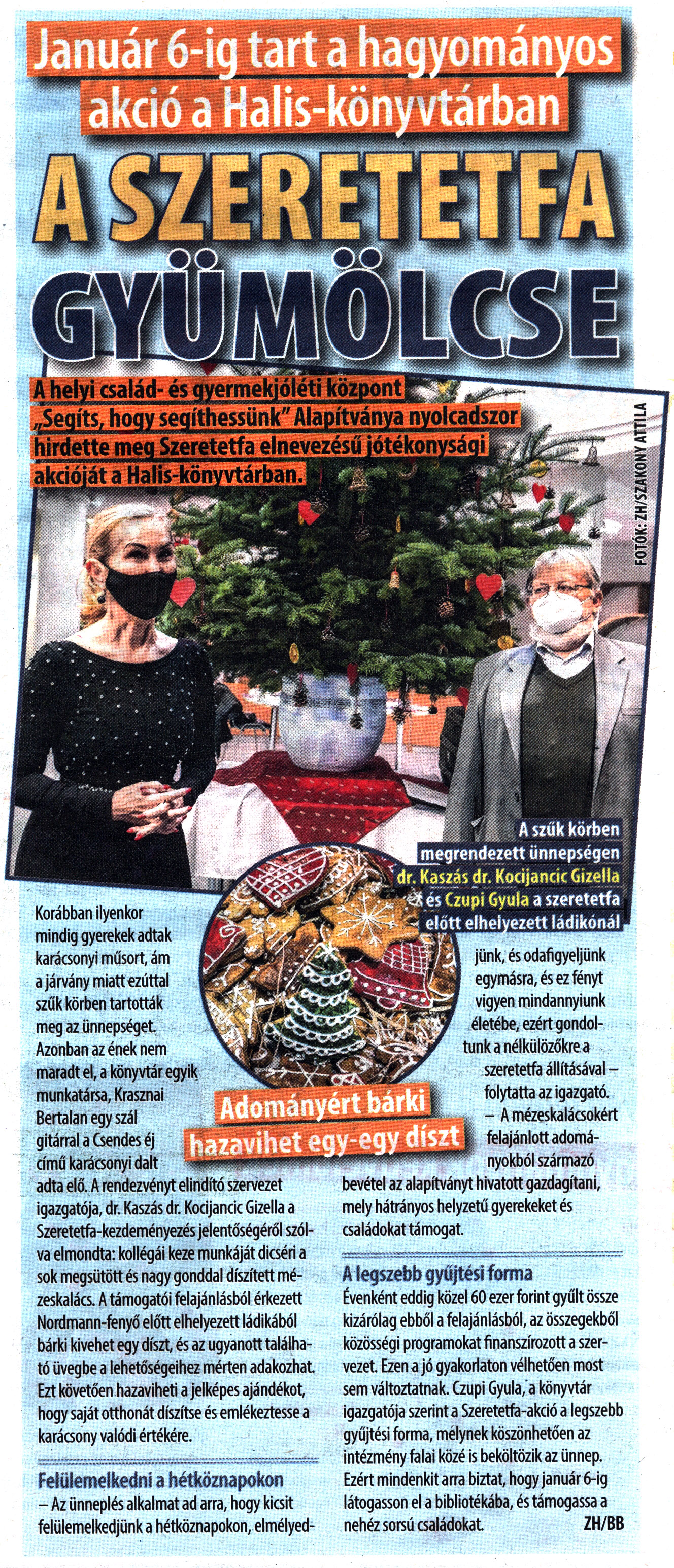 Nyilvános 2282 | 3924 | City7 2021. december 17. 39. szám 7. oldal | A szeretetfa gyümölcse Január 6-ig tart a hagyományos akció a Halis-könyvtárban A helyi család- és gyermekjóléti központ „Segíts, hogy segíthessünk" Alapítványa nyolcadszor hirdette meg Szeretetfa elnevezésű jótékonysági akcióját a Halis-könvvtárban. Korábban ilyenkor mindig gyerekek adtak karácsonyi műsort, ám a járvány miatt ezúttal szűk körben tartották meg az ünnepséget. Azonban az ének nem maradt el, a könyvtár egyik munkatársa, Krasznai Bertalan egy szál gitárral a Csendes éj című karácsonyi dalt adta elő. A rendezvényt elindító szervezet igazgatója, dr. Kaszás dr. Kocijancic Gizella a Szeretetfa-kezdeményezés jelentőségéről szólva elmondta: kollégái keze munkáját dicséri a sok megsütött és nagy gonddal díszített mézeskalács. A támogatói felajánlásból érkezett Nordmann-fenyő előtt elhelyezett ládikából bárki kivehet egy díszt, és az ugyanott található üvegbe a lehetőségeihez mérten adakozhat. Ezt követően hazaviheti a jelképes ajándékot, hogy saját otthonát díszítse és emlékeztesse a karácsony valódi értékére. Felülemelkedni a hétköznapokon - Az ünneplés alkalmat ad arra, hogy kicsit felülemelkedjünk a hétköznapokon, elmélyedjünk, és odafigyeljünk egymásra, és ez fényt vigyen mindannyiunk életébe, ezért gondoltunk a nélkülözőkre a szeretetfa állításával - folytatta az igazgató. - A mézeskalácsokért felajánlott adományokból származó bevétel az alapítványt hivatott gazdagítani, mely hátrányos helyzetű gyerekeket és családokat támogat. A legszebb gyűjtési forma Évenként eddig közel 60 ezer forint gyűlt össze kizárólag ebből a felajánlásból, az összegekből közösségi programokat finanszírozott a szervezet. Ezen a jó gyakorlaton vélhetően most sem változtatnak. Czupi Gyula, a könyvtár igazgatója szerint a Szeretetfa-akció a legszebb gyűjtési forma, melynek köszönhetően az intézmény falai közé is beköltözik az ünnep. Ezért mindenkit arra biztat, hogy január 6-ig látogasson el a bibliotékába, és támogassa a nehéz sorsú családokat. ZH/BB A szűk körben megrendezett ünnepségen dr. Kaszás dr. Kocijanicic Gizella és Czupi Gyula a szeretetfa előtt elhelyezett ládikónál. Fotók: ZH/Szakony Attila |