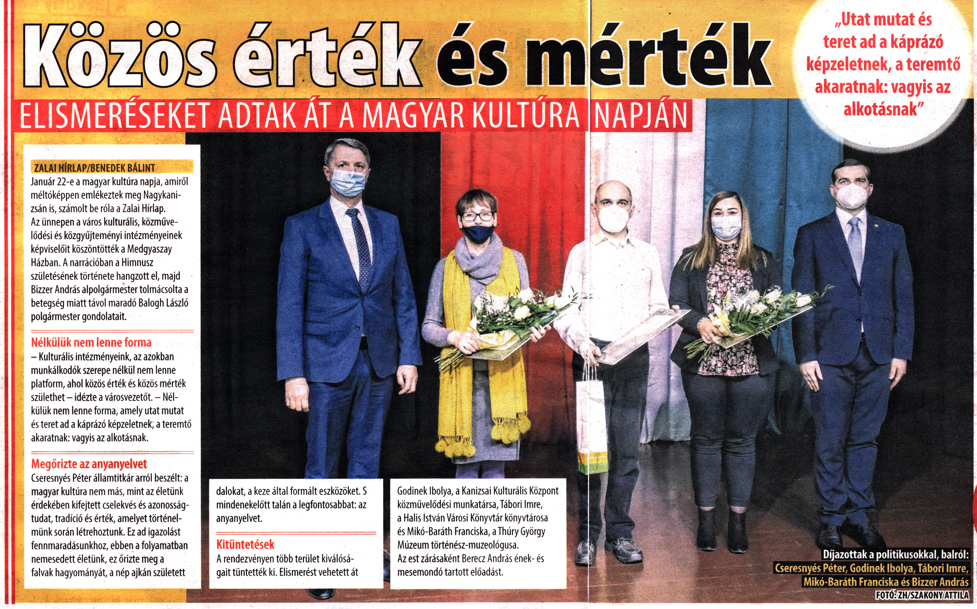 Nyilvános 2173 | 3174 | City7 magazin 2022. január 28. 4. szám 6-7. oldal | Közös érték és mérték - Elismeréseket adtak át a magyar kultúra napján „Utat mutat és teret ad a káprázó képzeletnek, a teremtő akaratnak: vagyis az alkotásnak" ZALAI HÍRLAP/BENEDEK BÁLINT Január 22-e a magyar kultúra napja, amiről méltóképpen emlékeztek meg Nagykanizsán is, számolt be róla a Zalai Hírlap. Az ünnepen a város kulturális, közművelődési és közgyűjteményi intézményeinek képviselőit köszöntötték a Medgyaszay Házban. A narrációban a Himnusz születésének története hangzott el, majd Bizzer András alpolgármester tolmácsolta a betegség miatt távol maradó Balogh László polgármester gondolatait. Nélkülük nem lenne forma - Kulturális intézményeink, az azokban munkálkodók szerepe nélkül nem lenne platform, ahol közös érték és közös mérték születhet - idézte a városvezetőt. - Nélkülük nem lenne forma, amely utat mutat és teret ad a káprázó képzeletnek, a teremtő akaratnak: vagyis az alkotásnak. Megőrizte az anyanyelvet Cseresnyés Péter államtitkár arról beszélt: a magyar kultúra nem más, mint az életünk érdekében kifejtett cselekvés és azonosságtudat, tradíció és érték, amelyet történelmünk során létrehoztunk. Ez ad igazolást fennmaradásunkhoz, ebben a folyamatban nemesedett életünk, ez őrizte meg a falvak hagyományát, a nép ajkán született dalokat, a keze által formált eszközöket. S mindenekelőtt talán a legfontosabbat: az anyanyelvet. Kitüntetések A rendezvényen több terület kiválóságait tüntették ki. Elismerést vehetett át Gödinek Ibolya, a Kanizsai Kulturális Központ közművelődési munkatársa, Tábori Imre, a Halis István Városi Könyvtár könyvtárosa és Mikó-Baráth Franciska, a Thúry György Múzeum történész-muzeológusa. Az est zárásaként Berecz András ének- és mesemondó tartott előadást. Díjazottak a politikusokkal, balról: Cseresnyés Péter, Gödinek Ibolya, Tábori Imre, Mikó-Baráth Franciska és Bizzer András |