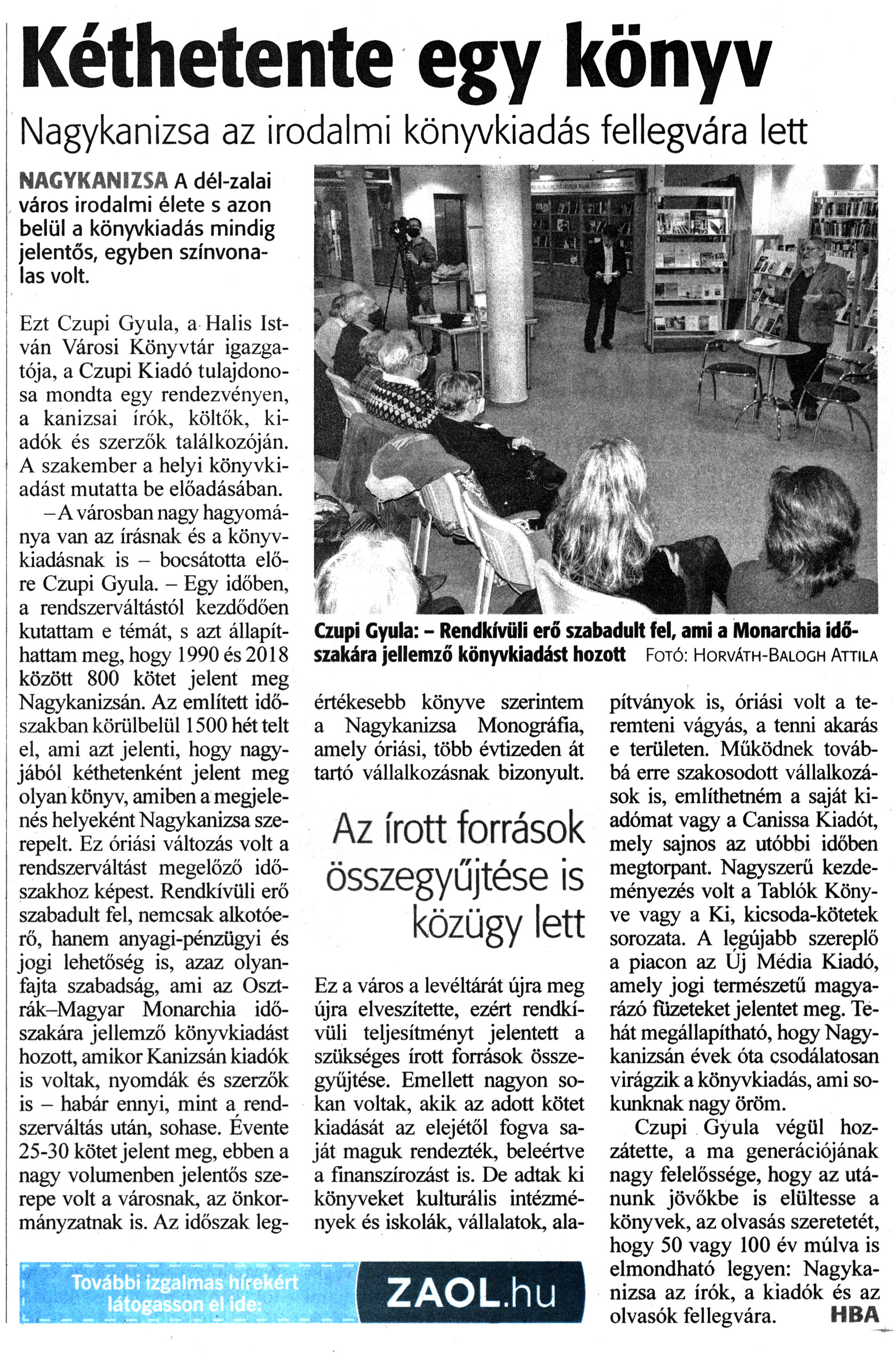 Nyilvános 1647 | 1929 | Zalai Hírlap 2022. március 23. 68. szám 12. oldal | Kéthetente egy könyv Nagykanizsa az irodalmi könyvkiadás fellegvára lett NAGYKANIZSA A dél-zalai város irodalmi élete s azon belül a könyvkiadás mindig jelentős, egyben színvonalas volt. Ezt Czupi Gyula, a Halis István Városi Könyvtár igazgatója, a Czupi Kiadó tulajdonosa mondta egy rendezvényen, a kanizsai írók, költők, kiadók és szerzők találkozóján. A szakember a helyi könyvkiadást mutatta be előadásában. -A városban nagy hagyománya van az írásnak és a könyvkiadásnak is - bocsátotta előre Czupi Gyula. - Egy időben, a rendszerváltástól kezdődően kutattam e témát, s azt állapíthattam meg, hogy 1990 és 2018 között 800 kötet jelent meg Nagykanizsán. Az említett időszakban körülbelül 1500 hét telt el, ami azt jelenti, hogy nagyjából kéthetenként jelent meg olyan könyv, amiben a megjelenés helyeként Nagykanizsa szerepelt. Ez óriási változás volt a rendszerváltást megelőző időszakhoz képest. Rendkívüli erő szabadult fel, nemcsak alkotóerő, hanem anyagi-pénzügyi és jogi lehetőség is, azaz olyanfajta szabadság, ami az Osztrák-Magyar Monarchia időszakára jellemző könyvkiadást hozott, amikor Kanizsán kiadók is voltak, nyomdák és szerzők is - habár ennyi, mint a rendszerváltás után, sohase. Évente 25-30 kötet jelent meg, ebben a nagy volumenben jelentős szerepe volt a városnak, az önkormányzatnak is. Az időszak legértékesebb könyve szerintem a Nagykanizsa Monográfia, amely óriási, több évtizeden át tartó vállalkozásnak bizonyult. Ez a város a levéltárát újra meg újra elveszítette, ezért rendkívüli teljesítményt jelentett a szükséges írott források összegyűjtése. Emellett nagyon sokan voltak, akik az adott kötet kiadását az elejétől fogva saját maguk rendezték, beleértve a finanszírozást is. De adtak ki könyveket kulturális intézmények és iskolák vállalatok ala- pítványok is, óriási volt a teremteni vágyás, a tenni akarás e területen. Működnek továbbá erre szakosodott vállalkozások is, említhetném a saját kiadómat vagy a Canissa Kiadót, mely sajnos az utóbbi időben megtorpant. Nagyszerű kezdeményezés volt a Tablók Könyve vagy a Ki, kicsoda-kötetek sorozata. A legújabb szereplő a piacon az Új Média Kiadó, amely jogi természetű magyarázó füzeteket jelentet meg. Tehát megállapítható, hogy Nagykanizsán évek óta csodálatosan virágzik a könyvkiadás, ami sokunknak nagy öröm. Czupi Gyula végül hozzátette, a ma generációjának nagy felelőssége, hogy az utánunk jövőkbe is elültesse a könyvek, az olvasás szeretetét, hogy 50 vagy 100 év múlva is elmondható legyen: Nagykanizsa az írók, a kiadók és az olvasók fellegvára. HBA Czupi Gyula: - Rendkívüli erő szabadult fel, ami a Monarchia időszakára jellemző könyvkiadást hozott Fotó: Horváth-Balogh Attila |
