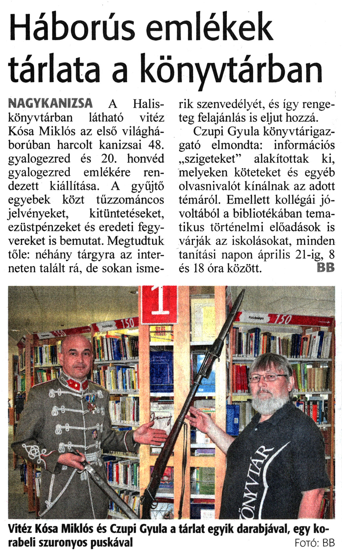 Nyilvános 1545 | 2037 | Zalai Hírlap 2022. március 23. 68. szám 20. oldal | Háborús emlékek tárlata a könyvtárban NAGYKANIZSA A Halis-könyvtárban látható vitéz Kósa Miklós az első világháborúban harcolt kanizsai 48. gyalogezred és 20. honvéd gyalogezred emlékére rendezett kiállítása. A gyűjtő egyebek közt tűzzománcos jelvényeket, kitüntetéseket, ezüstpénzeket és eredeti fegyvereket is bemutat. Megtudtuk tőle: néhány tárgyra az interneten talált rá, de sokan ismerik szenvedélyét, és így rengeteg felajánlás is eljut hozzá. Czupi Gyula könyvtárigazgató elmondta: információs „szigeteket" alakítottak ki, melyeken köteteket és egyéb olvasnivalót kínálnak az adott témáról. Emellett kollégái jóvoltából a bibliotékában tematikus történelmi előadások is várják az iskolásokat, minden tanítási napon április 21-ig, 8 és 18 óra között. BB Vitéz Kósa Miklós és Czupi Gyula a tárlat egyik darabjával, egy korabeli szuronyos puskával Fotó: BE |
