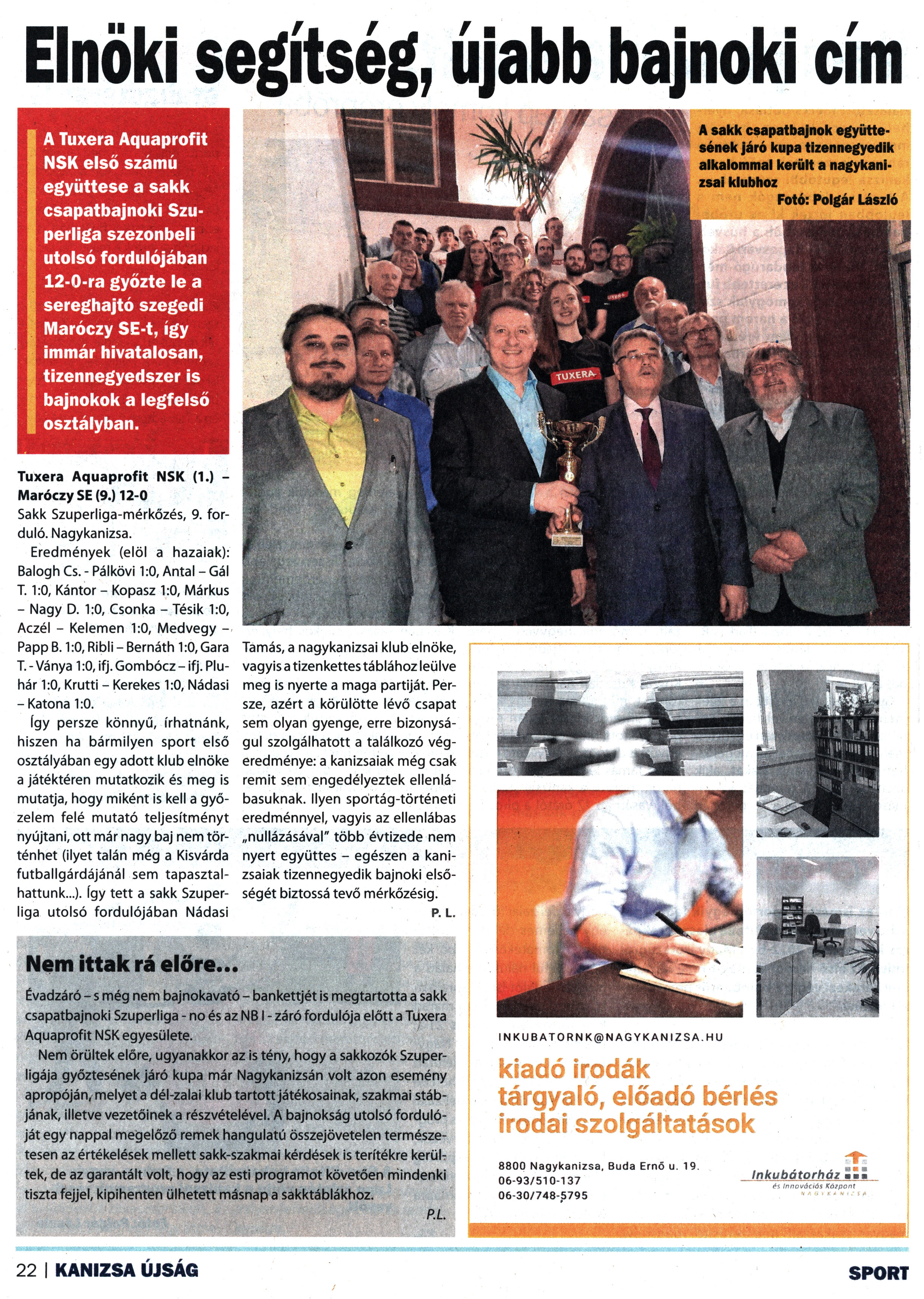 Nyilvános 1661 | 1975 | Kanizsa 2022. április 22. 8. szám 22. oldal | A Tuxera Aquaprofit NSK első számú együttese a sakk csapatbajnoki Szuperliga szezonbeli utolsó fordulójában 12-0-ra győzte le a sereghajtó szegedi Maróczy SE-t, így immár hivatalosan, tizennegyedszer is bajnokok a legfelső osztályban. 19. Elnöki segítség, újabb bajnoki cím Nem ittak rá előre... Tuxera Aquaprofit NSK (1.) -Maróczy SE (9.) 12-0 Sakk Szuperliga-mérkőzés, 9. forduló. Nagykanizsa. Eredmények (elöl a hazaiak): Balogh Cs. - Pálkövi 1:0, Antal - Gál T. 1:0, Kántor - Kopasz 1:0, Márkus - Nagy D. 1:0, Csonka - Tésik 1:0, Aczél - Kelemen 1:0, Medvegy -Papp B. 1:0, Ribli - Bernáth 1:0, Gara T. - Ványa 1:0, ifj. Gombócz - ifj. Plu-hár 1:0, Krutti - Kerekes 1:0, Nádasi -Katona 1:0. így persze könnyű, írhatnánk, hiszen ha bármilyen sport első osztályában egy adott klub elnöke a játéktéren mutatkozik és meg is mutatja, hogy miként is kell a győzelem felé mutató teljesítményt nyújtani, ott már nagy baj nem történhet (ilyet talán még a Kisvárda futballgárdájánál sem tapasztalhattunk...). így tett a sakk Szuperliga utolsó fordulójában Nádasi Tamás, a nagykanizsai klub elnöke, vagyis a tizenkettes táblához leülve meg is nyerte a maga partiját. Persze, azért a körülötte lévő csapat sem olyan gyenge, erre bizonyságul szolgálhatott a találkozó végeredménye: a kanizsaiak még csak remit sem engedélyeztek ellenlábasuknak. Ilyen sportág-történeti eredménnyel, vagyis az ellenlábas „nullázásával" több évtizede nem nyert együttes - egészen a kanizsaiak tizennegyedik bajnoki elsőségét biztossá tevő mérkőzésig. P. L. Évadzáró - s még nem bajnokavató - bankettjét is megtartotta a sakk csapatbajnoki Szuperliga - no és az NBI - záró fordulója előtt a Tuxera Aquaprofit NSK egyesülete. Nem örültek előre, ugyanakkor az is tény, hogy a sakkozók Szuperligája győztesének járó kupa már Nagykanizsán volt azon esemény apropóján, melyet a dél-zalai klub tartott játékosainak, szakmai stábjának, illetve vezetőinek a részvételével. A bajnokság utolsó fordulóját egy nappal megelőző remek hangulatú összejövetelen természetesen az értékelések mellett sakk-szakmai kérdések is terítékre került tek, de az garantált volt, hogy az esti programot követően mindenki tiszta fejjel, kipihenten ülhetett másnapa sakktáblákhoz. Pl. A sakk csapatbajnok együttesének járó kupa tizennegyedik alkalommal került a nagykanizsai klubhoz Fotó: Polgár László |