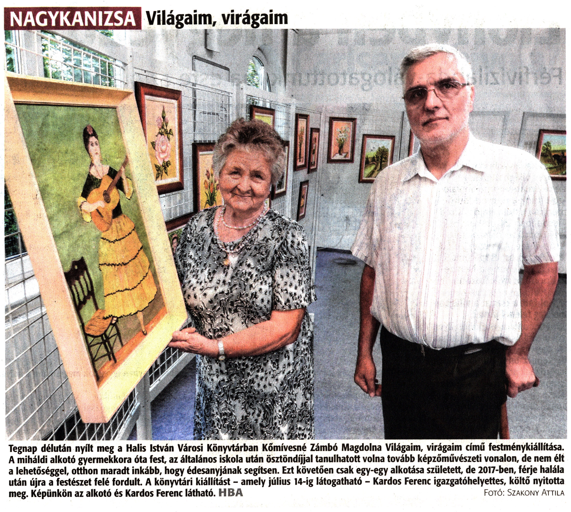 Nyilvános 1567 | 1815 | Zalai Hírlap 2022. június 29. 149. szám 16. oldal | NAGYKANIZSA Világaim, virágaim Tegnap délután nyílt meg a Halis István Városi Könyvtárban Kőmívesné Zámbó Magdolna Világaim, virágaim című festménykiállítása. A miháldi alkotó gyermekkora óta fest, az általános iskola után ösztöndíjjal tanulhatott volna tovább képzőművészeti vonalon, de nem élt a lehetőséggel, otthon maradt inkább, hogy édesanyjának segítsen. Ezt követően csak egy-egy alkotása született, de 2017-ben, férje halála után újra a festészet felé fordult. A könyvtári kiállítást - amely július 14-ig látogatható - Kardos Ferenc igazgatóhelyettes, költő nyitotta meg. Képünkön az alkotó és Kardos Ferenc látható. HBA Fotó: Szakony Attila |