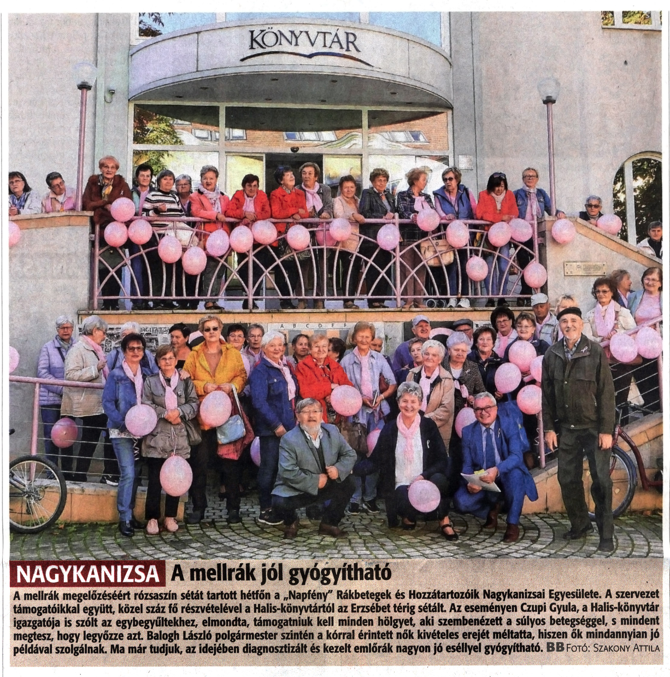 Nyilvános 1582 | 1973 | Zalai Hírlap 2022. október 4. 231. szám 1. oldal | Nagykanizsa - A mellrák jól gyógyítható A mellrák megelőzéséért rózsaszín sétát tartott hétfőn a „Napfény" Rákbetegek és Hozzátartozóik Nagykanizsai Egyesülete. A szervezet támogatóikkal együtt, közel száz fő részvételévei a Halis-könyvtártól az Erzsébet térig sétált. Az eseményen Czupi Gyula, a Halis-könyvtár igazgatója is szólt az egybegyűltekhez, elmondta, támogatniuk kell minden hölgyet, aki szembenézett a súlyos betegséggel, s mindent megtesz, hogy legyőzze azt. Balogh László polgármester szintén a kórral érintett nők kivételes erejét méltatta, hiszen ők mindannyian jó példával szolgálnak. Ma már tudjuk, az idejében diagnosztizált és kezelt emlőrák nagyon jó eséllyel gyógyítható. BB fotó: Szakony Attila |