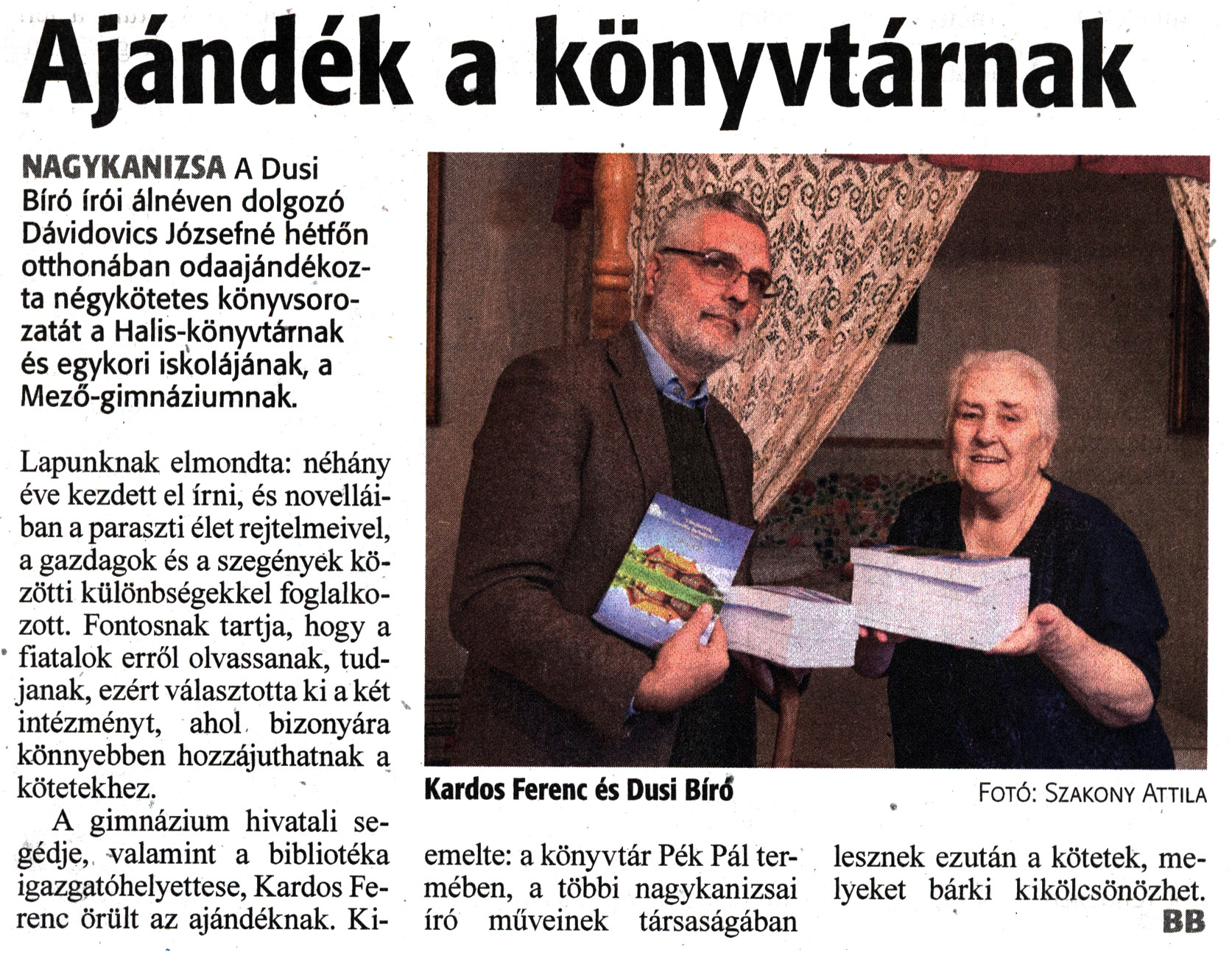 Nyilvános 1461 | 1720 | Zalai Hírlap 2022. november 16. 267. szám 2. oldal | Ajándék a könyvtárnak NAGYKANIZSA A Dusi Bíró írói álnéven dolgozó Dávidovics Józsefné hétfőn otthonában odaajándékozta négykötetes könyvsorozatát a Halis-könyvtárnak és egykori iskolájának, a Mező-gimnáziumnak. Lapunknak elmondta: néhány éve kezdett el írni, és novelláiban a paraszti élet rejtelmeivel, a gazdagok és a szegények közötti különbségekkel foglalkozott. Fontosnak tartja, hogy a fiatalok erről olvassanak, tudjanak, ezért választotta ki a két intézményt, ahol bizonyára könnyebben hozzájuthatnak a kötetekhez. A gimnázium hivatali segédje, valamint a bibliotéka igazgatóhelyettese, Kardos Ferenc örült az ajándéknak. Kiemelte: a könyvtár Pék Pál termében, a többi nagykanizsai író műveinek társaságában lesznek ezután a kötetek, melyeket bárki kikölcsönözhet. BB Kardos Ferenc és Dusi Bírd Fotó: Szakony Attila |