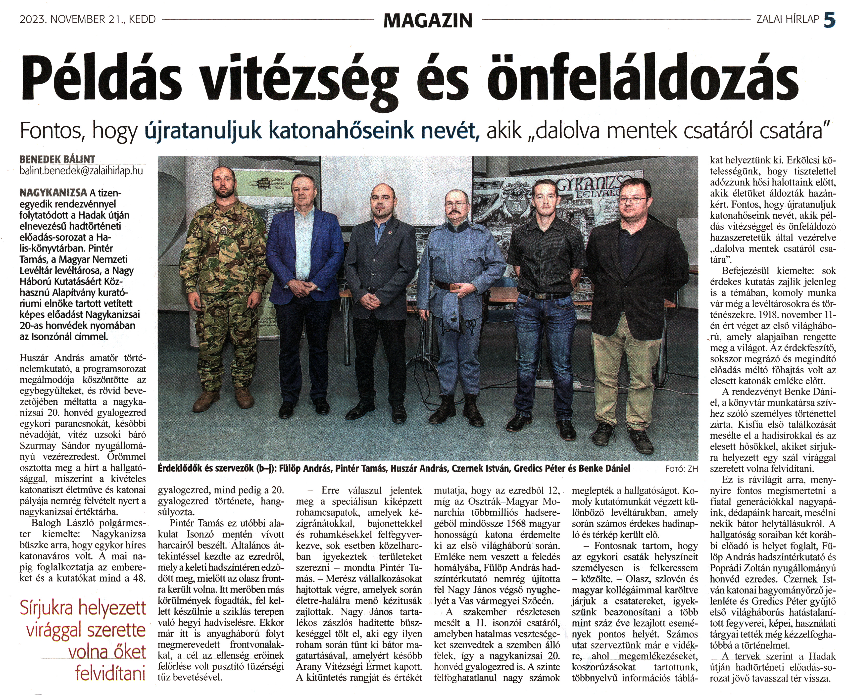 Nyilvános 1447 | 1734 | Zalai Hírlap 2023. november 21. 271. szám 5. oldal | Példás vitézség és önfeláldozás Fontos, hogy újratanuljuk katonahőseink nevét, akik „dalolva mentek csatáról csatára" Érdeklődők és szervezők (b-j): Fülöp András, Pintér Tamás, Huszár András, Czernek István, Gredics Péter és Benke Dániel Fotó: ZH BENEDEK BÁLINT balint.benedek@zalaihirlap.hu NAGYKANIZSA A tizenegyedik rendezvénnyel folytatódott a Hadak útján elnevezésű hadtörténeti előadás-sorozat a Halis-könyvtárban. Pintér Tamás, a Magyar Nemzeti Levéltár levéltárosa, a Nagy Háború Kutatásáért Közhasznú Alapítvány kuratóriumi elnöke tartott vetített képes előadást Nagykanizsai 20-as honvédek nyomában az Isonzónál címmel. Huszár András amatőr történelemkutató, a programsorozat megálmodója köszöntötte az egybegyűlteket, és rövid bevezetőjében méltatta a nagykanizsai 20. honvéd gyalogezred egykori parancsnokát, későbbi névadóját, vitéz uzsoki báró Szurmay Sándor nyugállományú vezérezredest. Örömmel osztotta meg a hírt a hallgatósággal, miszerint a kivételes katonatiszt életműve és katonai pályája nemrég felvételt nyert a nagykanizsai értéktárba. Balogh László polgármester kiemelte: Nagykanizsa büszke arra, hogy egykor híres katonaváros volt. A mai napig foglalkoztatja az embereket és a kutatókat mind a 48. gyalogezred, mind pedig a 20. gyalogezred története, hangsúlyozta. Pintér Tamás ez utóbbi alakulat Isonzó mentén vívott harcairól beszélt. Általános áttekintéssel kezdte az ezredről, mely a keleti hadszíntéren edződött meg, mielőtt az olasz frontra került volna. Itt merőben más körülmények fogadták, fel kellett készülnie a sziklás terepen való hegyi hadviselésre. Ekkor már itt is anyagháború folyt megmerevedett frontvonalakkal, a cél az ellenség erőinek felőrlése volt pusztító tüzérségi tűz bevetésével. - Erre válaszul jelentek meg a speciálisan kiképzett rohamcsapatok, amelyek kézigránátokkal, bajonettekkel és rohamkésekkel felfegyverkezve, sok esetben közelharcban igyekeztek területeket szerezni - mondta Pintér Tamás. - Merész vállalkozásokat hajtottak végre, amelyek során életre-halálra menő kézitusák zajlottak. Nagy János tartalékos zászlós haditette büszkeséggel tölt el, aki egy ilyen roham során tűnt ki bátor magatartásával, amelyért később Arany Vitézségi Érmet kapott. A kitüntetés rangját és értékét mutatja, hogy az ezredből 12, míg az Osztrák-Magyar Monarchia többmilliós hadseregéből mindössze 1568 magyar honosságú katona érdemelte ki az első világháború során. Emléke nem veszett a feledés homályába, Fülöp András hadszíntérkutató nemrég újította fel Nagy János végső nyughelyét a Vas vármegyei Szőcén. A szakember részletesen mesélt a 11. isonzói csatáról, amelyben hatalmas veszteségeket szenvedtek a szemben álló felek, így a nagykanizsai 20. honvéd gyalogezred is. A szinte felfoghatatlanul nagy számok meglepték a hallgatóságot. Komoly kutatómunkát végzett különböző levéltárakban, amely során számos érdekes hadinapló és térkép került elő. - Fontosnak tartom, hogy az egykori csaták helyszíneit személyesen is felkeressem - közölte. - Olasz, szlovén és magyar kollégáimmal karöltve járjuk a csatatereket, igyekszünk beazonosítani a több mint száz éve lezajlott események pontos helyét. Számos utat szerveztünk már e vidékre, ahol megemlékezéseket, koszorúzásokat tartottunk, többnyelvű információs táblákat helyeztünk ki. Erkölcsi kötelességünk, hogy tisztelettel adózzunk hősi halottaink előtt, akik életüket áldozták hazánkért. Fontos, hogy újratanuljuk katonahőseink nevét, akik példás vitézséggel és önfeláldozó hazaszeretetük által vezérelve „dalolva mentek csatáról csatára". Befejezésül kiemelte: sok érdekes kutatás zajlik jelenleg is a témában, komoly munka vár még a levéltárosokra és történészekre. 1918. november 11-én ért véget az első világháború, amely alapjaiban rengette meg a világot. Az érdekfeszítő, sokszor megrázó és megindító előadás méltó főhajtás volt az elesett katonák emléke előtt. A rendezvényt Benke Dániel, a könyvtár munkatársa szívhez szóló személyes történettel zárta. Kisfia első találkozását mesélte el a hadisírokkal és az elesett hősökkel, akiket sírjukra helyezett egy szál virággal szeretett volna felvidítani. Ez is rávilágít arra, menynyire fontos megismertetni a fiatal generációkkal nagyapáink, dédapáink harcait, mesélni nekik bátor helytállásukról. A hallgatóság soraiban két korábbi előadó is helyet foglalt, Fülöp András hadszíntérkutató és Poprádi Zoltán nyugállományú honvéd ezredes. Czernek István katonai hagyományőrző jelenléte és Gredics Péter gyűjtő első világháborús hatástalanított fegyverei, képei, használati tárgyai tették még kézzelfoghatóbbá a történelmet. A tervek szerint a Hadak útján hadtörténeti előadás-sorozatjövő tavasszal tér vissza. |