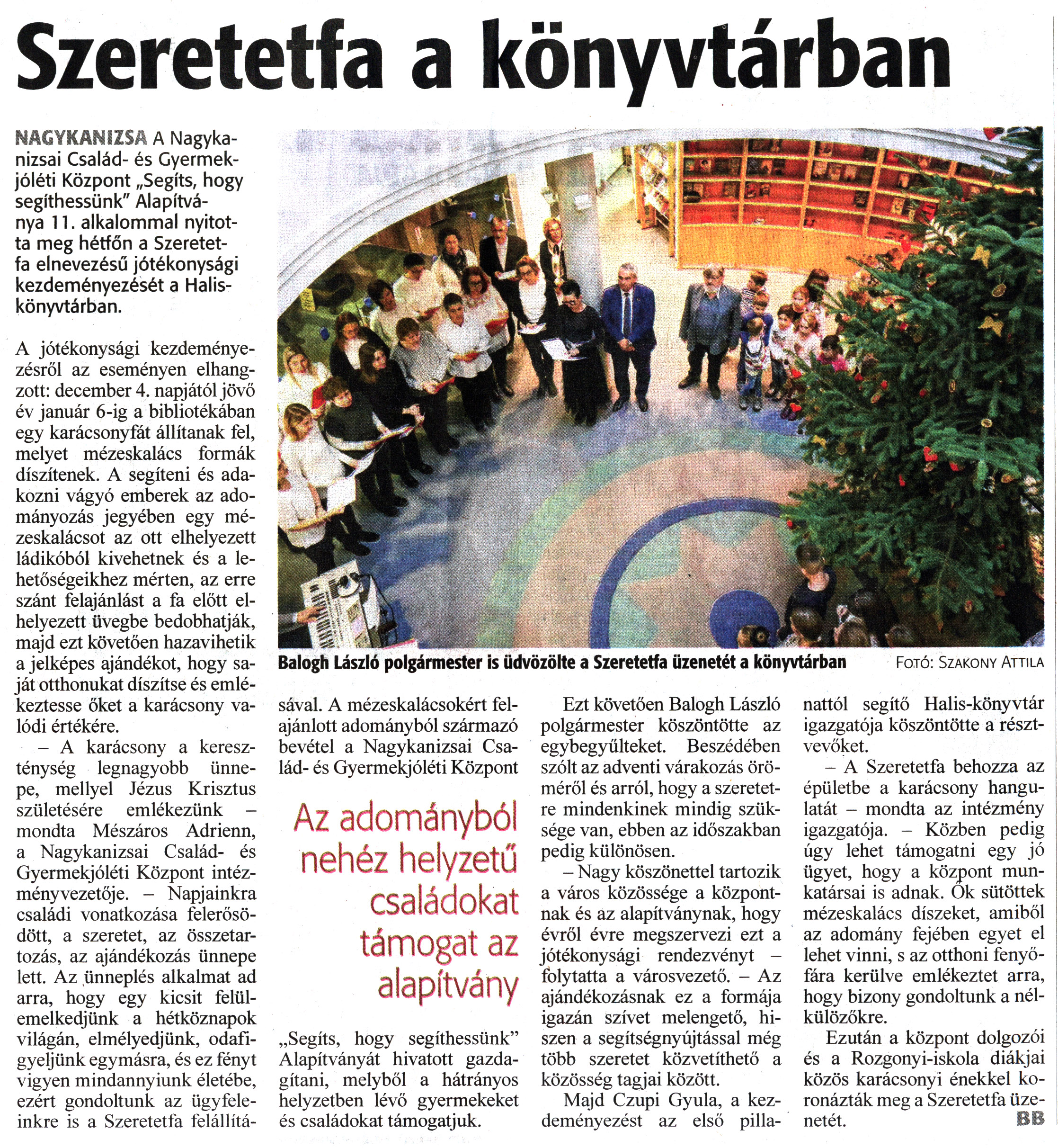 Nyilvános 1420 | 1888 | Zalai Hírlap 2023. december 5. 283. szám 2. oldal | Szeretetfa a könyvtárban Balogh László polgármester is üdvözölte a Szeretetfa üzenetét a könyvtárban Fotó: Szakony Attila NAGYKANIZSA A Nagykanizsai Család- és Gyermekjóléti Központ „Segíts, hogy segíthessünk" Alapítványa 11. alkalommal nyitotta meg hétfőn a Szeretetfa elnevezésű jótékonysági kezdeményezését a Halis-könyvtárban. A jótékonysági kezdeményezésről az eseményen elhangzott: december 4. napjától jövő év január 6-ig a bibliotékában egy karácsonyfát állítanak fel, melyet mézeskalács formák díszítenek. A segíteni és adakozni vágyó emberek az adományozás jegyében egy mézeskalácsot az ott elhelyezett ládikóból kivehetnek és a lehetőségeikhez mérten, az erre szánt felajánlást a fa előtt elhelyezett üvegbe bedobhatják, majd ezt követően hazavihetik a jelképes ajándékot, hogy saját otthonukat díszítse és emlékeztesse őket a karácsony valódi értékére. - A karácsony a kereszténység legnagyobb ünnepe, mellyel Jézus Krisztus születésére emlékezünk -mondta Mészáros Adrienn, a Nagykanizsai Család- és Gyermekjóléti Központ intézményvezetője. - Napjainkra családi vonatkozása felerősödött, a szeretet, az összetartozás, az ajándékozás ünnepe lett. Az ünneplés alkalmat ad arra, hogy egy kicsit felülemelkedjünk a hétköznapok világán, elmélyedjünk, odafigyeljünk egymásra, és ez fényt vigyen mindannyiunk életébe, ezért gondoltunk az ügyfeleinkre is a Szeretetfa felállításával. A mézeskalácsokért felajánlott adományból származó bevétel a Nagykanizsai Család- és Gyermekjóléti Központ „Segíts, hogy segíthessünk" Alapítványát hivatott gazdagítani, melyből a hátrányos helyzetben lévő gyermekeket és családokat támogatjuk. Ezt követően Balogh László polgármester köszöntötte az egybegyűlteket. Beszédében szólt az adventi várakozás öröméről és arról, hogy a szeretetre mindenkinek mindig szüksége van, ebben az időszakban pedig különösen. - Nagy köszönettel tartozik a város közössége a központnak és az alapítványnak, hogy évről évre megszervezi ezt a jótékonysági rendezvényt -folytatta a városvezető. - Az ajándékozásnak ez a formája igazán szívet melengető, hiszen a segítségnyújtással még több szeretet közvetíthető a közösség tagjai között. Majd Czupi Gyula, a kezdeményezést az első pillanattól segítő Halis-könyvtár igazgatója köszöntötte a résztvevőket. - A Szeretetfa behozza az épületbe a karácsony hangulatát - mondta az intézmény igazgatója. - Közben pedig úgy lehet támogatni egy jó ügyet, hogy a központ munkatársai is adnak. Ők sütöttek mézeskalács díszeket, amiből az adomány fejében egyet el lehet vinni, s az otthoni fenyőfára kerülve emlékeztet arra, hogy bizony gondoltunk a nélkülözőkre. Ezután a központ dolgozói és a Rozgonyi-iskola diákjai közös karácsonyi énekkel koronázták meg a Szeretetfa üzenetét. " BB |