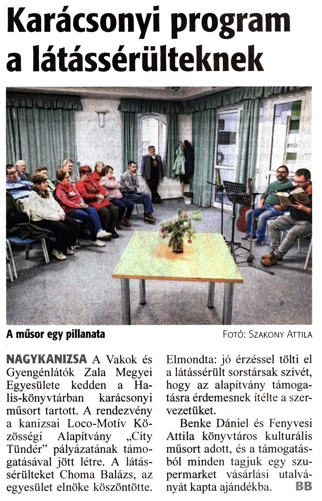 Nyilvános 1444 | 1739 | Zalai Hírlap 2023. december 13. 290. szám 1. oldal | Karácsonyi program a látássérülteknek A műsor egy pillanata Fotó: Szakony Attila NAGYKANIZSA A Vakok és Gyengénlátók Zala Megyei Egyesülete kedden a Halis-könyvtárban karácsonyi műsort tartott. A rendezvény a kanizsai Loco-Motív Közösségi Alapítvány „City Tündér" pályázatának támogatásával jött létre. A látássérülteket Choma Balázs, az egyesület elnöke köszöntötte. Elmondta: jó érzéssel tölti el a látássérült sorstársak szívét, hogy az alapítvány támogatásra érdemesnek ítélte a szervezetüket. Benke Dániel és Fenyvesi Attila könyvtáros kulturális műsort adott, és a támogatásból minden tagjuk egy szupermarket vásárlási utalványát kapta ajándékba. BB |