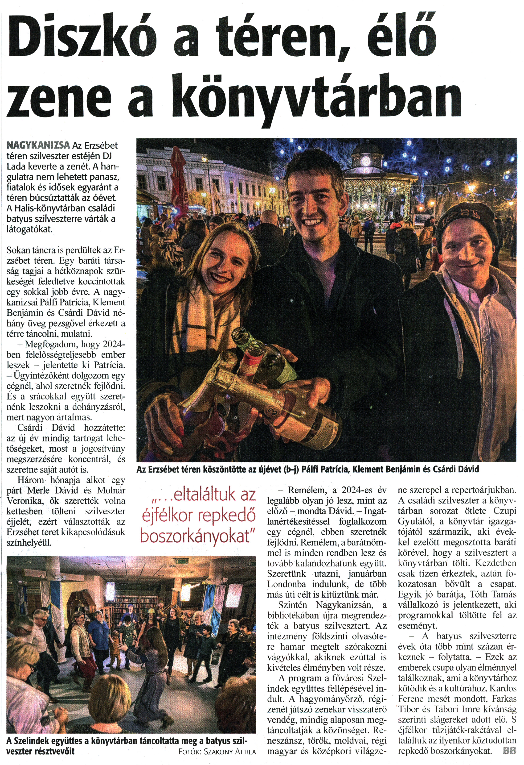 Nyilvános 1453 | 1858 | Zalai Hírlap 2024. január 2. 1. szám 3. oldal | Diszkó a téren, élő zene a könyvtárban Az Erzsébet téren köszöntötte az újévet (b-j) Pálfi Patrícia, Klement Benjámin és Csárdi Dávid NAGYKANIZSA Az Erzsébet téren szilveszter estéjén DJ Lada keverte a zenét. A hangulatra nem lehetett panasz, fiatalok és idősek egyaránt a téren búcsúztatták az óévet. A Halis-könyvtárban családi batyus szilveszterre várták a látogatókat. Sokan táncra is perdültek az Erzsébet téren. Egy baráti társaság tagjai a hétköznapok szürkeségét feledtetve koccintottak egy sokkal jobb évre. A nagykanizsai Pálfi Patrícia, Klement Benjámin és Csárdi Dávid néhány üveg pezsgővel érkezett a térre táncolni, mulatni. - Megfogadom, hogy 2024-ben felelősségteljesebb ember leszek - jelentette ki Patrícia. - Ügyintézőként dolgozom egy cégnél, ahol szeretnék fejlődni. És a srácokkal együtt szeretnénk leszokni a dohányzásról, mert nagyon ártalmas. Csárdi Dávid hozzátette: az új év mindig tartogat lehetőségeket, most a jogosítvány megszerzésére koncentrál, és szeretne saját autót is. Három hónapja alkot egy párt Merle Dávid és Molnár Veronika, ők szerették volna kettesben tölteni szilveszter éjjelét, ezért választották az Erzsébet teret kikapcsolódásuk színhelyéül. - Remélem, a 2024-es év legalább olyan jó lesz, mint az előző - mondta Dávid. - Ingatlanértékesítéssel foglalkozom egy cégnél, ebben szeretnék fejlődni. Remélem, a barátnőmmel is minden rendben lesz és tovább kalandozhatunk együtt. Szeretünk utazni, januárban Londonba indulunk, de több más úti célt is kitűztünk már. Szintén Nagykanizsán, a bibliotékában újra megrendezték a bátyus szilvesztert. Az intézmény földszinti olvasótere hamar megtelt szórakozni vágyókkal, akiknek ezúttal is kivételes élményben volt része. A program a fővárosi Szelindek együttes fellépésével indult. A hagyományőrző, régizenétjátszó zenekar visszatérő vendég, mindig alaposan megtáncoltatják a közönséget. Reneszánsz, török, moldvai, régi magyar és középkori világzene szerepel a repertoárjukban. A családi szilveszter a könyvtárban sorozat ötlete Czupi Gyulától, a könyvtár igazgatójától származik, aki évekkel ezelőtt megosztotta baráti körével, hogy a szilvesztert a könyvtárban tölti. Kezdetben csak tízen érkeztek, aztán fokozatosan bővült a csapat. Egyik jó barátja, Tóth Tamás vállalkozó is jelentkezett, aki programokkal töltötte fel az eseményt. - A batyus szilveszterre évek óta több mint százan érkeznek - folytatta. - Ezek az emberek csupa olyan élménnyel találkoznak, ami a könyvtárhoz kötődik és a kultúrához. Kardos Ferenc mesét mondott, Farkas Tibor és Tábori Imre kívánság szerinti slágereket adott elő. S éjfélkor tűzijáték-rakétával eltaláltuk az ilyenkor köztudottan repkedő boszorkányokat. BB A Szelindek együttes a könyvtárban táncoltatta meg a bátyus szilveszter résztvevőit Fotók: Szakony Attila |