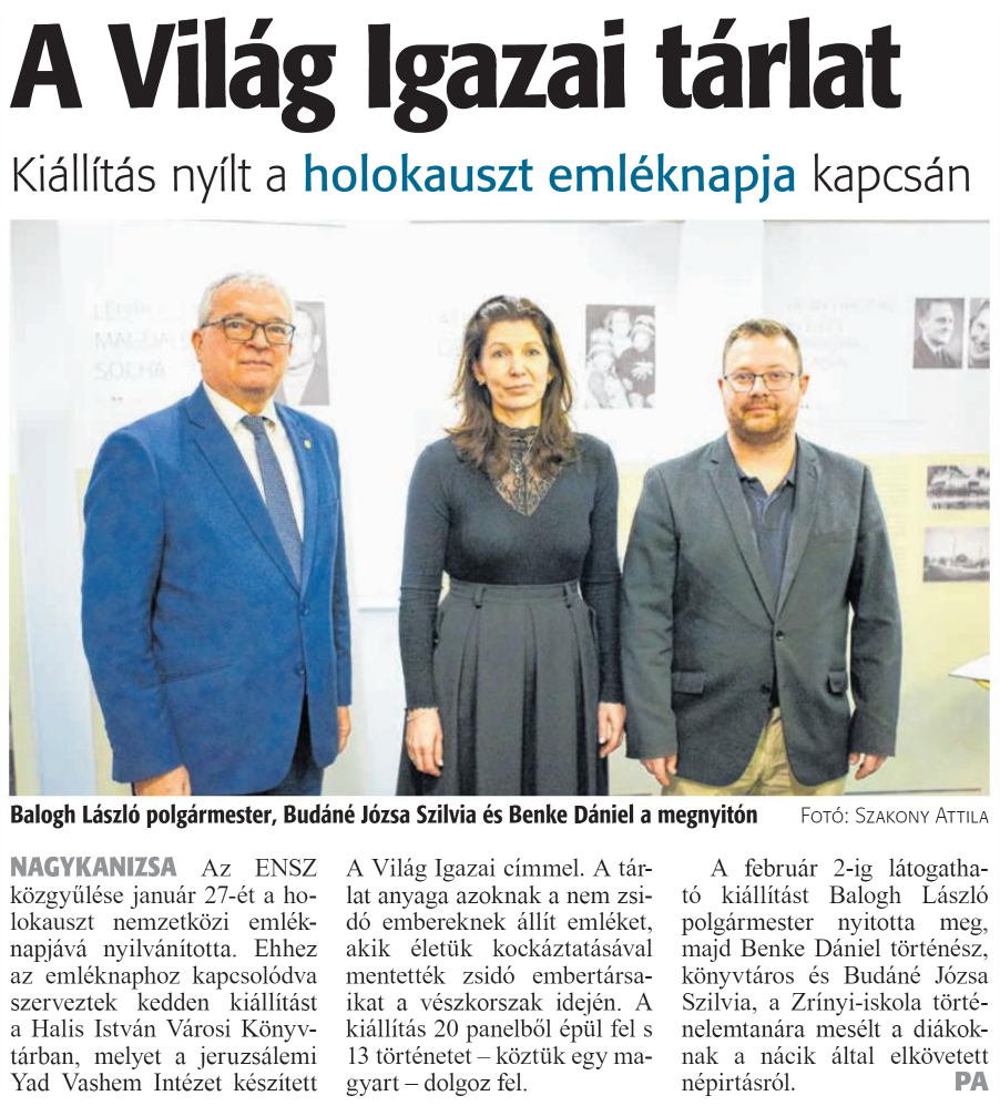Nyilvános 1391 | 1940 | Zalai Hírlap 2024. január 24. 20. szám 16. oldal | A Világ Igazai tárlat Kiállítás nyílt a holokauszt emléknapja kapcsán Balogh László polgármester, Budáné Józsa Szilvia és Benke Dániel a megnyitón Fotó: Szakony Attila NAGYKANIZSA Az ENSZ közgyűlése január 27-ét a holokauszt nemzetközi emléknapjává nyilvánította. Ehhez az emléknaphoz kapcsolódva szerveztek kedden kiállítást a Halis István Városi Könyvtárban, melyet a jeruzsálemi Yad Vashem Intézet készített A Világ Igazai címmel. A tárlat anyaga azoknak a nem zsidó embereknek állít emléket, akik életük kockáztatásával mentették zsidó embertársaikat a vészkorszak idején. A kiállítás 20 panelből épül fel s 13 történetet - köztük egy magyart - dolgoz fel. A február 2-ig látogatható kiállítást Balogh László polgármester nyitotta meg, majd Benke Dániel történész, könyvtáros és Budáné Józsa Szilvia, a Zrínyi-iskola történelemtanára mesélt a diákoknak a nácik által elkövetett népirtásról. PA |