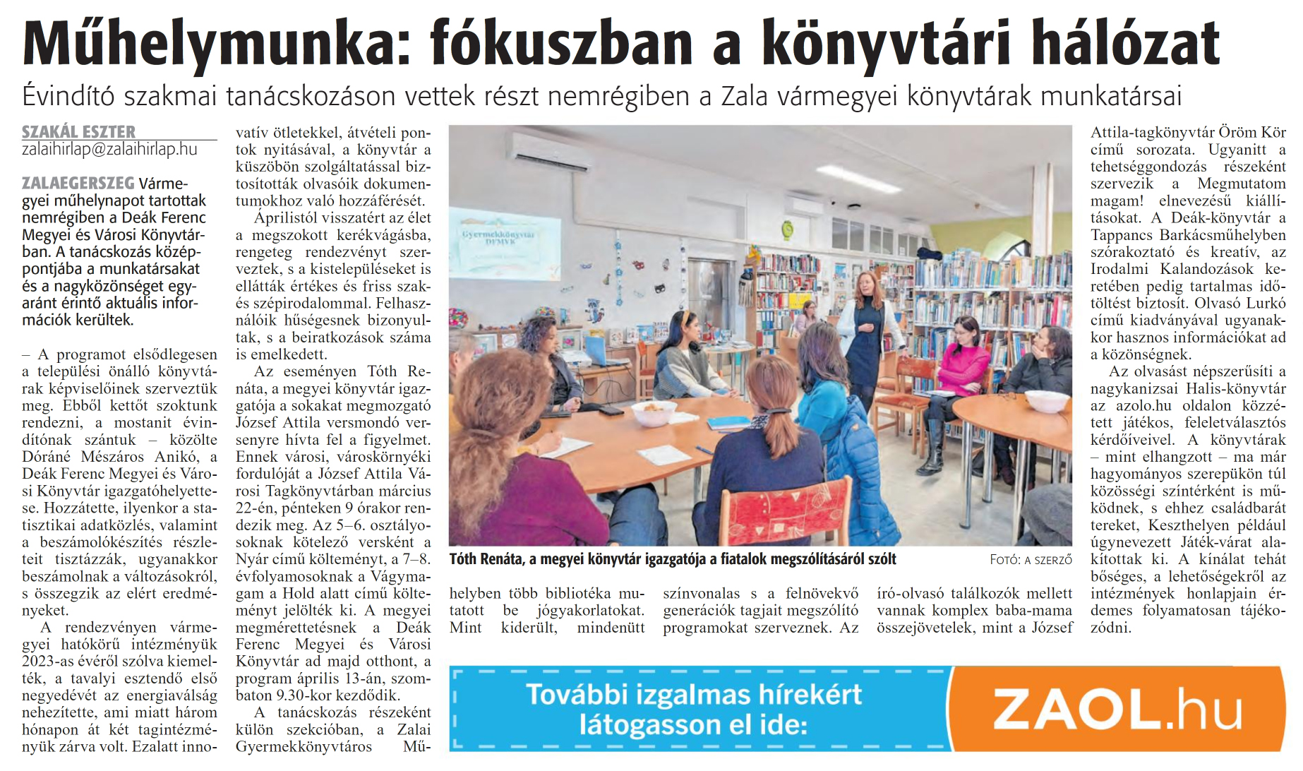 Nyilvános 1406 | 1721 | Zalai Hírlap 2024. február 13. 37. szám 5. oldal | Műhelymunka: fókuszban a könyvtári hálózat Évindító szakmai tanácskozáson vettek részt nemrégiben a Zala vármegyei könyvtárak munkatársai SZAKÁL ESZTER zalaihirlap@zalaihirlap.hu ZALAEGERSZEG Vármegyei műhelynapot tartottak nemrégiben a Deák Ferenc Megyei és Városi Könyvtárban. A tanácskozás középpontjába a munkatársakat és a nagyközönséget egyaránt érintő aktuális információk kerültek. - A programot elsődlegesen a települési önálló könyvtárak képviselőinek szerveztük meg. Ebből kettőt szoktunk rendezni, a mostanit évindítónak szántuk - közölte Dóráné Mészáros Anikó, a Deák Ferenc Megyei és Városi Könyvtár igazgatóhelyettese. Hozzátette, ilyenkor a statisztikai adatközlés, valamint a beszámolókészítés részleteit tisztázzák, ugyanakkor beszámolnak a változásokról, s összegzik az elért eredményeket. A rendezvényen vármegyei hatókörű intézményük 2023-as évéről szólva kiemelték, a tavalyi esztendő első negyedévét az energiaválság nehezítette, ami miatt három hónapon át két tagintézményük zárva volt. Ezalatt innovatív ötletekkel, átvételi pontok nyitásával, a könyvtár a küszöbön szolgáltatással biztosították olvasóik dokumentumokhoz való hozzáférését. Áprilistól visszatért az élet a megszokott kerékvágásba, rengeteg rendezvényt szerveztek, s a kistelepüléseket is ellátták értékes és friss szak- és szépirodalommal. Felhasználóik hűségesnek bizonyultak, s a beiratkozások száma is emelkedett. Az eseményen Tóth Renáta, a megyei könyvtár igazgatója a sokakat megmozgató József Attila versmondó versenyre hívta fel a figyelmet. Ennek városi, városkörnyéki fordulóját a József Attila Városi Tagkönyvtárban március 22-én, pénteken 9 órakor rendezik meg. Az 5-6. osztályosoknak kötelező versként a Nyár című költeményt, a 7-8. évfolyamosoknak a Vágymagam a Hold alatt című költeményt jelölték ki. A megyei megmérettetésnek a Deák Ferenc Megyei és Városi Könyvtár ad majd otthont, a program április 13-án, szombaton 9.30-kor kezdődik. A tanácskozás részeként külön szekcióban, a Zalai Gyermekkönyvtáros Műhelyben több bibliotéka mutatott be jógyakorlatokat. Mint kiderült, mindenütt színvonalas s a felnövekvő generációk tagjait megszólító programokat szerveznek. Az író-olvasó találkozók mellett vannak komplex baba-mama összejövetelek, mint a József Attila-tagkönyvtár Öröm Kör című sorozata. Ugyanitt a tehetséggondozás részeként szervezik a Megmutatom magam! elnevezésű kiállításokat. A Deák-könyvtár a Tappancs Barkácsmühelyben szórakoztató és kreatív, az Irodalmi Kalandozások keretében pedig tartalmas időtöltést biztosít. Olvasó Lurkó című kiadványával ugyanakkor hasznos információkat ad a közönségnek. Az olvasást népszerűsíti a nagykanizsai Halis-könyvtár az azolo.hu oldalon közzétett játékos, feleletválasztós kérdőíveivel. A könyvtárak - mint elhangzott - ma már hagyományos szerepükön túl közösségi színtérként is működnek, s ehhez családbarát tereket, Keszthelyen például úgynevezett Játék-várat alakítottak ki. A kínálat tehát bőséges, a lehetőségekről az intézmények honlapjain érdemes folyamatosan tájékozódni. Tóth Renáta, a megyei könyvtár igazgatója a fiatalok megszólításáról szólt Fotó: a szerző |