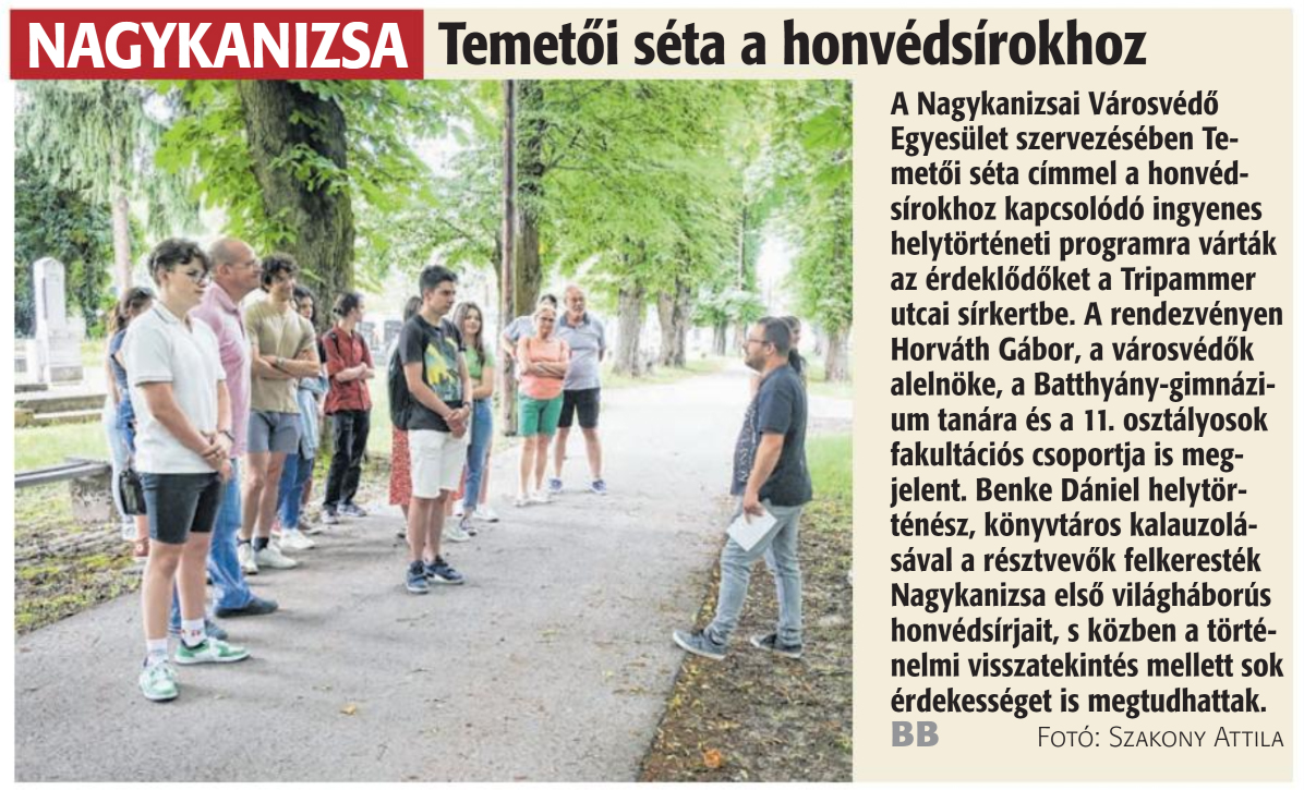 Nyilvános 1340 | 1561 | Zalai Hírlap 2024. június 11. 134. szám 16. oldal | Temetői séta a honvédsírokhoz NAGYKANIZSA A Nagykanizsai Városvédő Egyesület szervezésében Temetői séta címmel a honvédsírokhoz kapcsolódó ingyenes helytörténeti programra várták az érdeklődőket a Tripammer utcai sírkertbe. A rendezvényen Horváth Gábor, a városvédők alelnöke, a Batthyány-gimnázium tanára és a 11. osztályosok fakultációs csoportja is megjelent. Benke Dániel helytörténész, könyvtáros kalauzolásával a résztvevők felkeresték Nagykanizsa első világháborús honvédsírjait, s közben a történelmi visszatekintés mellett sok érdekességet is megtudhattak. BB Fotó: Szakony Attila |
