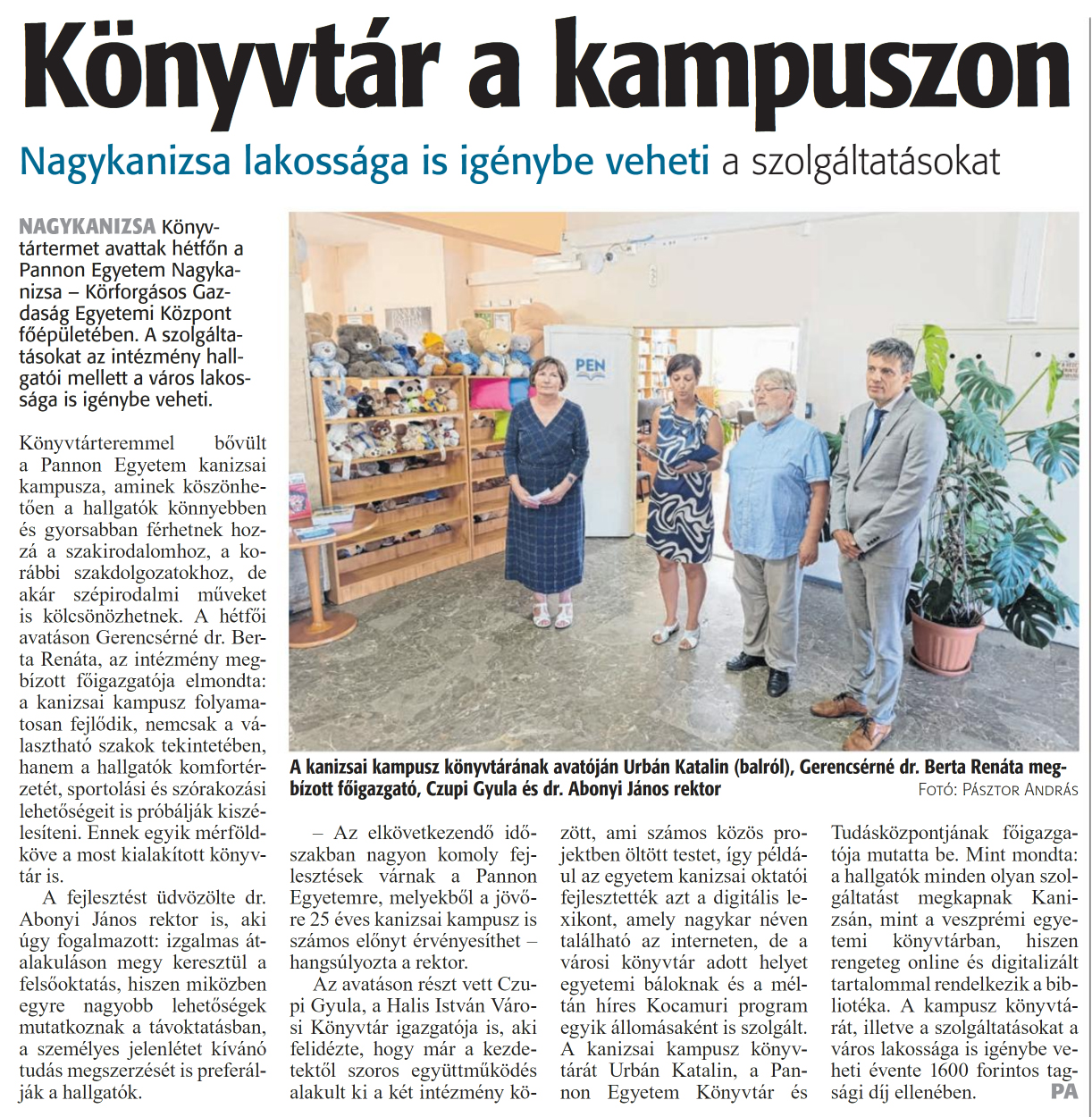 Nyilvános 1374 | 1709 | Zalai Hírlap 2024. szeptember 3. 205. szám 2. oldal | Könyvtár a kampuszon Nagykanizsa lakossága is igénybe veheti a szolgáltatásokat NAGYKANIZSA Könyvtártermet avattak hétfőn a Pannon Egyetem Nagykanizsa - Körforgásos Gazdaság Egyetemi Központ főépületében. A szolgáltatásokat az intézmény hallgatói mellett a város lakossága is igénybe veheti. Könyvtárteremmel bővült a Pannon Egyetem kanizsai kampusza, aminek köszönhetően a hallgatók könnyebben és gyorsabban férhetnek hozzá a szakirodalomhoz, a korábbi szakdolgozatokhoz, de akár szépirodalmi műveket is kölcsönözhetnek. A hétfői avatáson Gerencsérné dr. Berta Renáta, az intézmény megbízott főigazgatója elmondta: a kanizsai kampusz folyamatosan fejlődik, nemcsak a választható szakok tekintetében, hanem a hallgatók komfortérzetét, sportolási és szórakozási lehetőségeit is próbálják kiszélesíteni. Ennek egyik mérföldköve a most kialakított könyvtár is. A fejlesztést üdvözölte dr. Abonyi János rektor is, aki úgy fogalmazott: izgalmas átalakuláson megy keresztül a felsőoktatás, hiszen miközben egyre nagyobb lehetőségek mutatkoznak a távoktatásban, a személyes jelenlétet kívánó tudás megszerzését is preferálják a hallgatók. - Az elkövetkezendő időszakban nagyon komoly fejlesztések várnak a Pannon Egyetemre, melyekből a jövőre 25 éves kanizsai kampusz is számos előnyt érvényesíthet -hangsúlyozta a rektor. Az avatáson részt vett Czupi Gyula, a Halis István Városi Könyvtár igazgatója is, aki felidézte, hogy már a kezdetektől szoros együttműködés alakult ki a két intézmény között, ami számos közös projektben öltött testet, így például az egyetem kanizsai oktatói fejlesztették azt a digitális lexikont, amely nagykar néven található az interneten, de a városi könyvtár adott helyet egyetemi báloknak és a méltán híres Kocamuri program egyik állomásaként is szolgált. A kanizsai kampusz könyvtárát Urbán Katalin, a Pannon Egyetem Könyvtár és Tudásközpontjának főigazgatója mutatta be. Mint mondta: a hallgatók minden olyan szolgáltatást megkapnak Kanizsán, mint a veszprémi egyetemi könyvtárban, hiszen rengeteg online és digitalizált tartalommal rendelkezik a bibliotéka. A kampusz könyvtárát, illetve a szolgáltatásokat a város lakossága is igénybe veheti évente 1600 forintos tagsági díj ellenében. PA A kanizsai kampusz könyvtárának avatóján Urbán Katalin (balról), Gerencsérné dr. Berta Renáta megbízott főigazgató, Czupi Gyula és dr. Abonyi János rektor Fotó: Pásztor András |