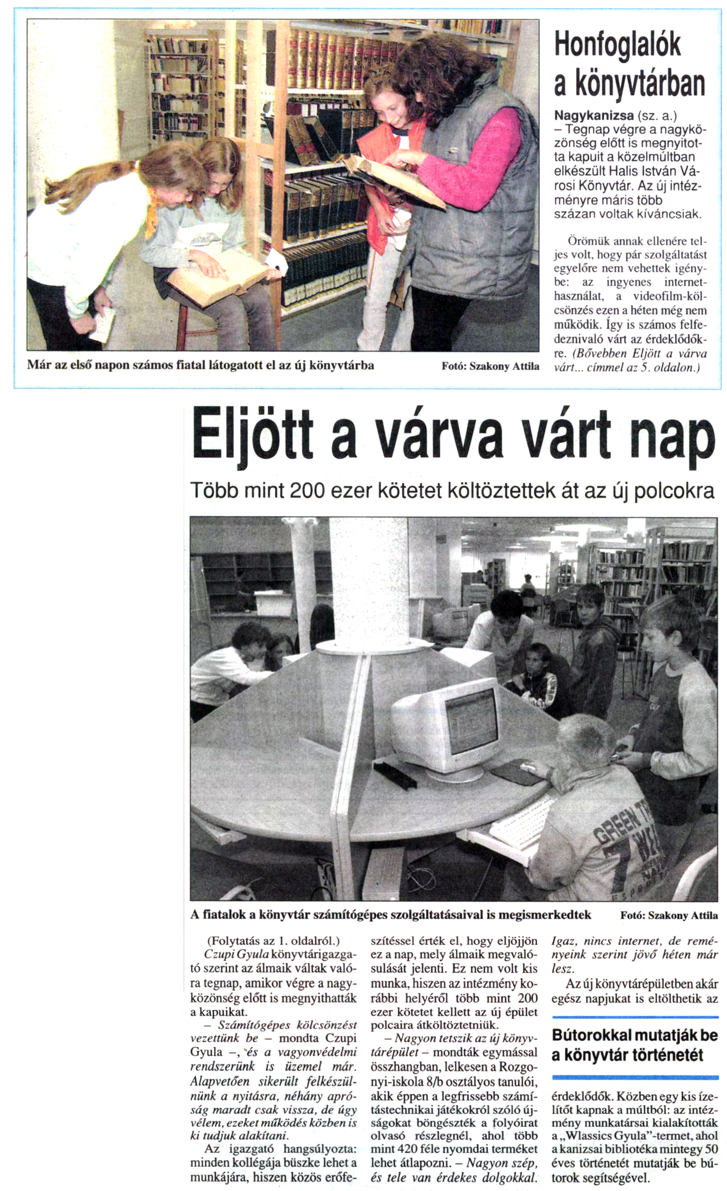 Nyilvános 1349 | 1486 | Zalai Hírlap 2001. október 2. 230. szám 1, 5. oldal | Már az első napon számos fiatal látogatott el az új könyvtárba Fotó: Szakony Attila Honfoglalók a könyvtárban Nagykanizsa (sz. a.) - Tegnap végre a nagyközönség előtt is megnyitotta kapuit a közelmúltban elkészült Halis István Városi Könyvtár. Az új intézményre máris több százan voltak kíváncsiak. Örömük annak ellenére teljes volt, hogy pár szolgáltatást egyelőre nem vehettek igénybe: az ingyenes internethasználat, a videofilm-kölcsönzés ezen a héten még nem működik. így is számos felfe-deznivaló várt az érdeklődőkre. (Bővebben Eljött a várva várt... címmel az 5. oldalon.) Eljött a várva várt nap Több mint 200 ezer kötetet költöztettek át az új polcokra A fiatalok a könyvtár számítógépes szolgáltatásaival is megismerkedtek Fotó: Szakony Attila (Folytatás az 1. oldalról.) Czupi Gyula könyvtárigazgató szerint az álmaik váltak valóra tegnap, amikor végre a nagyközönség előtt is megnyithatták a kapuikat. - Számítógépes kölcsönzést vezettünk be - mondta Czupi Gyula -, és a vagyonvédelmi rendszerünk is üzemel már. Alapvetően sikerült felkészülnünk a nyitásra, néhány apróság maradt csak vissza, de úgy vélem, ezeket működés közben is ki tudjuk alakítani. Az igazgató hangsúlyozta: minden kollégája büszke lehet a munkájára, hiszen közös erőfeszítéssel érték el, hogy eljöjjön ez a nap, mely álmaik megvalósulását jelenti. Ez nem volt kis munka, hiszen az intézmény korábbi helyéről több mint 200 ezer kötetet kellett az új épület polcaira átköltöztetniük. — Nagyon tetszik az új könyvtárépület - mondták egymással összhangban, lelkesen a Rozgonyi-iskola 8/b osztályos tanulói, akik éppen a legfrissebb számítástechnikai játékokról szóló újságokat böngészték a folyóirat olvasó részlegnél, ahol több mint 420 féle nyomdai terméket lehet átlapozni. - Nagyon szép, és tele van érdekes dolgokkal. Igaz, nincs internet, de reményeink szerint jövő héten már lesz. Az új könyvtárépületben akár egész napjukat is eltölthetik az érdeklődők. Közben egy kis ízelítőt kapnak a múltból: az intézmény munkatársai kialakították a „Wlassics Gyula"-termet, ahol a kanizsai bibliotéka mintegy 50 éves történetét mutatják be bútorok segítségével. |