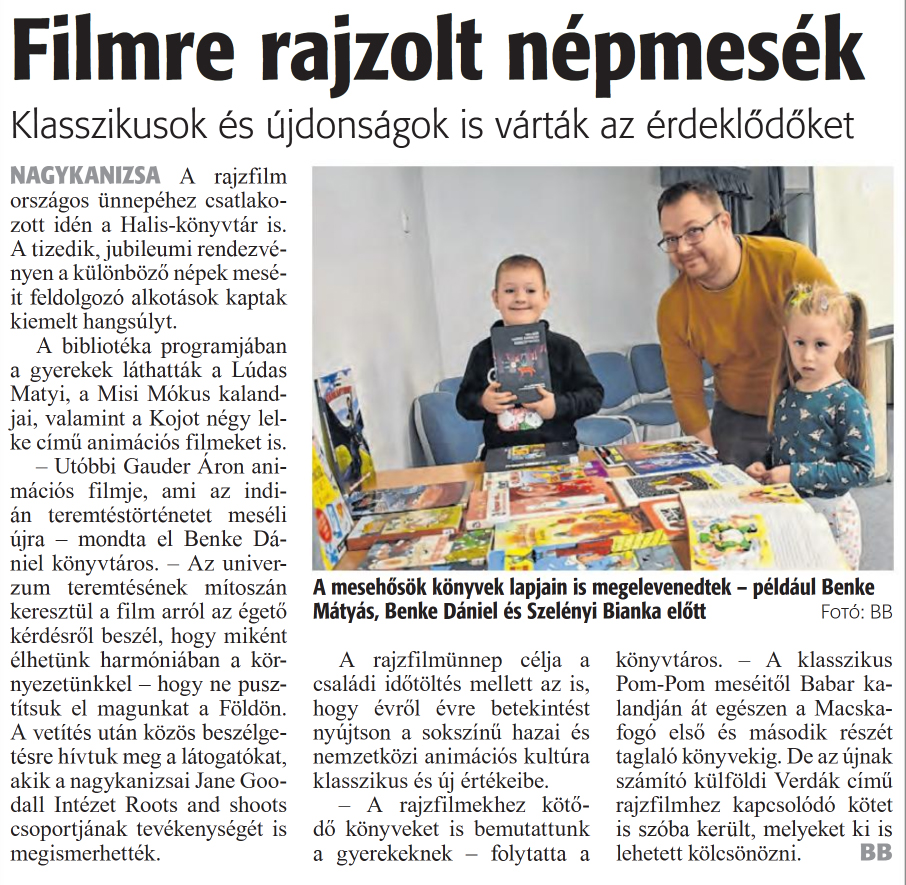 Nyilvános 1277 | 1515 | Zalai Hírlap 2024. november 18. 268. szám 16. oldal | Filmre rajzolt népmesék Klasszikusok és újdonságok is várták az érdeklődőket NAGYKANIZSA A rajzfilm országos ünnepéhez csatlakozott idén a Halis-könyvtár is. A tizedik, jubileumi rendezvényen a különböző népek meséit feldolgozó alkotások kaptak kiemelt hangsúlyt. A bibliotéka programjában a gyerekek láthatták a Lúdas Matyi, a Misi Mókus kalandjai, valamint a Kojot négy lelke című animációs filmeket is. - Utóbbi Gauder Áron animációs filmje, ami az indián teremtéstörténetet meséli újra - mondta el Benke Dániel könyvtáros. - Az univerzum teremtésének mítoszán keresztül a film arról az égető kérdésről beszél, hogy miként élhetünk harmóniában a környezetünkkel - hogy ne pusztítsuk el magunkat a Földön. A vetítés után közös beszélgetésre hívtuk meg a látogatókat, akik a nagykanizsai Jane Goo-dall Intézet Roots and shoots csoportjának tevékenységét is megismerhették. A rajzfilmünnep célja a családi időtöltés mellett az is, hogy évről évre betekintést nyújtson a sokszínű hazai és nemzetközi animációs kultúra klasszikus és új értékeibe. - A rajzfilmekhez kötődő könyveket is bemutattunk a gyerekeknek - folytatta a könyvtáros. - A klasszikus Pom-Pom meséitől Babar kalandján át egészen a Macskafogó első és második részét taglaló könyvekig. De az újnak számító külföldi Verdák című rajzfilmhez kapcsolódó kötet is szóba került, melyeket ki is lehetett kölcsönözni. BB A mesehősök könyvek lapjain is megelevenedtek - például Benke Mátyás, Benke Dániel és Szelényi Bianka előtt Fotó: BB |