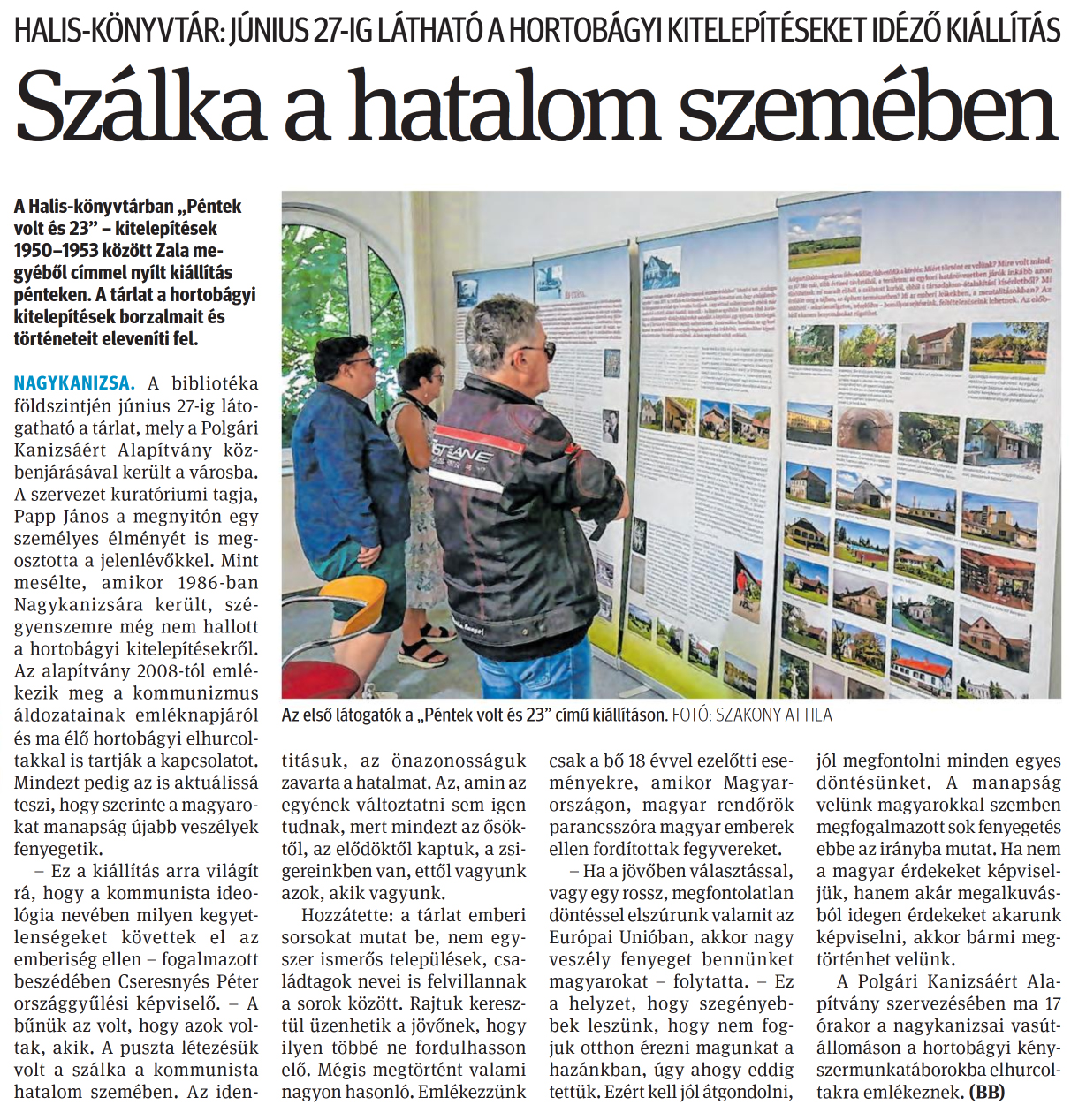 Nyilvános 1325 | 1814 | Zalai Hírlap 2025. június 16. 137. szám 3. oldal | HALIS-KÖNYVTÁR: JÚNIUS 27-IG LÁTHATÓ A HORTOBÁGYI KITELEPÍTÉSEKET IDÉZŐ KIÁLLÍTÁS Szálka a hatalom szemében Az első látogatók a „Péntek volt és 23" című kiállításon. FOTÓ: SZAKONY ATTILA A Halis-könyvtárban „Péntek volt és 23" - kitelepítések 1950-1953 között Zala megyéből címmel nyílt kiállítás pénteken. A tárlat a hortobágyi kitelepítések borzalmait és történeteit eleveníti fel. NAGYKANIZSA. A bibliotéka földszintjén június 27-ig látogatható a tárlat, mely a Polgári Kanizsáért Alapítvány közbenjárásával került a városba. A szervezet kuratóriumi tagja, Papp János a megnyitón egy személyes élményét is megosztotta a jelenlévőkkel. Mint mesélte, amikor 1986-ban Nagykanizsára került, szégyenszemre még nem hallott a hortobágyi kitelepítésekről. Az alapítvány 2008-tól emlékezik meg a kommunizmus áldozatainak emléknapjáról és ma élő hortobágyi elhurcol-takkal is tartják a kapcsolatot. Mindezt pedig az is aktuálissá teszi, hogy szerinte a magyarokat manapság újabb veszélyek fenyegetik. - Ez a kiállítás arra világít rá, hogy a kommunista ideológia nevében milyen kegyetlenségeket követtek el az emberiség ellen - fogalmazott beszédében Cseresnyés Péter országgyűlési képviselő. - A bűnük az volt, hogy azok voltak, akik. A puszta létezésük volt a szálka a kommunista hatalom szemében. Az identitásuk, az önazonosságuk zavarta a hatalmat. Az, amin az egyének változtatni sem igen tudnak, mert mindezt az ősöktől, az elődöktől kaptuk, a zsigereinkben van, ettől vagyunk azok, akik vagyunk. Hozzátette: a tárlat emberi sorsokat mutat be, nem egyszer ismerős települések, családtagok nevei is felvillannak a sorok között. Rajtuk keresztül üzenhetik a jövőnek, hogy ilyen többé ne fordulhasson elő. Mégis megtörtént valami nagyon hasonló. Emlékezzünk csak a bő 18 évvel ezelőtti eseményekre, amikor Magyarországon, magyar rendőrök parancsszóra magyar emberek ellen fordítottak fegyvereket. - Ha a jövőben választással, vagy egy rossz, megfontolatlan döntéssel elszúrunk valamit az Európai Unióban, akkor nagy veszély fenyeget bennünket magyarokat - folytatta. - Ez a helyzet, hogy szegényebbek leszünk, hogy nem fogjuk otthon érezni magunkat a hazánkban, úgy ahogy eddig tettük. Ezért kell jól átgondolni, jól megfontolni minden egyes döntésünket. A manapság velünk magyarokkal szemben megfogalmazott sok fenyegetés ebbe az irányba mutat. Ha nem a magyar érdekeket képviseljük, hanem akár megalkuvásból idegen érdekeket akarunk képviselni, akkor bármi megtörténhet velünk. A Polgári Kanizsáért Alapítvány szervezésében ma 17 órakor a nagykanizsai vasútállomáson a hortobágyi kényszermunkatáborokba elhurcol-takra emlékeznek. (BB) |