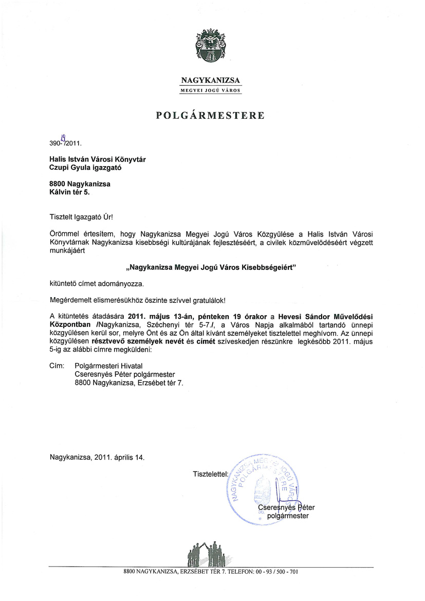 Nyilvános 1781 | 3744 | Rövid leírás | Teljes leírás (1.35 KB) | NAGYKANIZSA MEGYEI JOGÚ VÁROS POLGÁRMESTERE 390-19/2011. Halis István Városi Könyvtár Czupi Gyula igazgató 8800 Nagykanizsa Kálvin tér 5. Tisztelt Igazgató Úr! Örömmel értesítem, hogy Nagykanizsa Megyei Jogú Város Közgyűlése a Halis István Városi Könyvtárnak Nagykanizsa kisebbségi kultúrájának fejlesztéséért, a civilek közművelődéséért végzett munkájáért „Nagykanizsa Megyei Jogú Város Kisebbségeiért” kitüntető címet adományozza. Megérdemelt elismerésükhöz őszinte szívvel gratulálok! A kitüntetés átadására 2011. május 13-án, pénteken 19 órakor a Hevesi Sándor Művelődési Központban /Nagykanizsa, Széchenyi tér 5-7./, a Város Napja alkalmából tartandó ünnepi közgyűlésen kerül sor, melyre Önt és az Ön által kívánt személyeket tisztelettel meghívom. Az ünnepi közgyűlésen résztvevő személyek nevét és címét szíveskedjen részünkre legkésőbb 2011. május 5-ig az alábbi címre megküldeni: Cím: Polgármesteri Hivatal Cseresnyés Péter polgármester 8800 Nagykanizsa, Erzsébet tér 7. Nagykanizsa, 2011. április 14. Tisztelettel: Cseresnyés Péter polgármester |