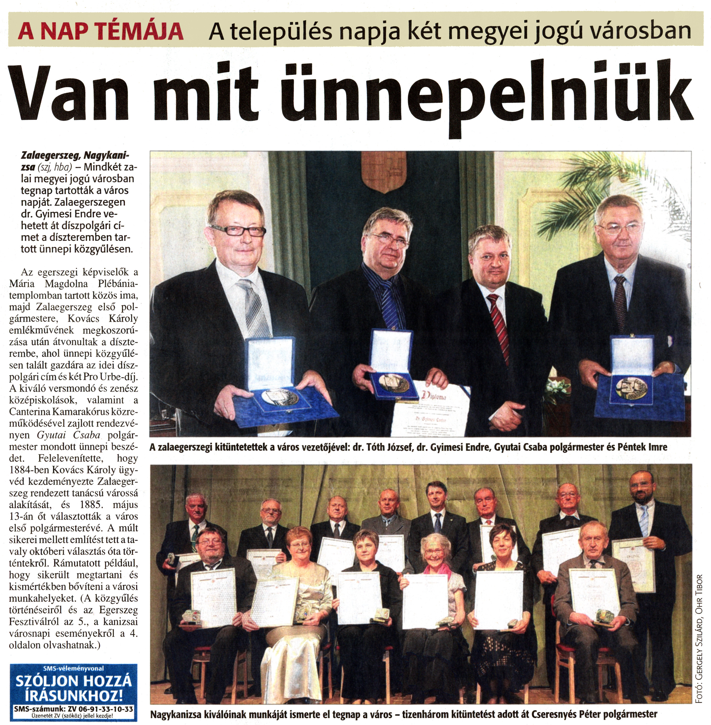 Nyilvános 2017 | 4378 | Rövid leírás | Teljes leírás (1.75 KB) | Zalai Hírlap 2011. május 14. 112. szám 1. oldal - Van mit ünnepelniük A cikk szövege: A NAP TÉMÁJA A település napja két megyei jogú városban Van mit ünnepelniük Zalaegerszeg, Nagykanizsa (szj, hba) - Mindkét zalai megyei jogú városban tegnap tartották a város napját. Zalaegerszegen dr. Gyimesi Endre vehetett át díszpolgári címet a díszteremben tartott ünnepi közgyűlésen. Az egerszegi képviselők a Mária Magdolna Plébániatemplomban tartott közös ima, majd Zalaegerszeg első polgármestere, Kovács Károly emlékművének megkoszorúzása után átvonultak a díszterembe, ahol ünnepi közgyűlésen talált gazdára az idei díszpolgári cím és két Pro Urbe-díj. A kiváló versmondó és zenész középiskolások, valamint a Canterina Kamarakórus közreműködésével zajlott rendezvényen Gyutai Csaba polgármester mondott ünnepi beszédet. Felelevenítette, hogy 1884-ben Kovács Károly ügyvéd kezdeményezte Zalaegerszeg rendezett tanácsú várossá alakítását, és 1885. május 13-án őt választották a város első polgármesterévé. A múlt sikerei mellett említést tett a tavaly októberi választás óta történtekről. Rámutatott például, hogy sikerült megtartani és kismértékben bővíteni a városi munkahelyeket. (A közgyűlés történéseiről és az Egerszeg Fesztiválról az 5., a kanizsai városnapi eseményekről a 4. oldalon olvashatnak.) A zalaegerszegi kitüntetettek a város vezetőjével: dr. Tóth József, dr. Gyimesi Endre, Gyutai Csaba polgármester és Péntek Imre Nagykanizsa kiválóinak munkáját ismerte el tegnap a város - tizenhárom kitüntetést adott át Cseresnyés Péter polgármester |