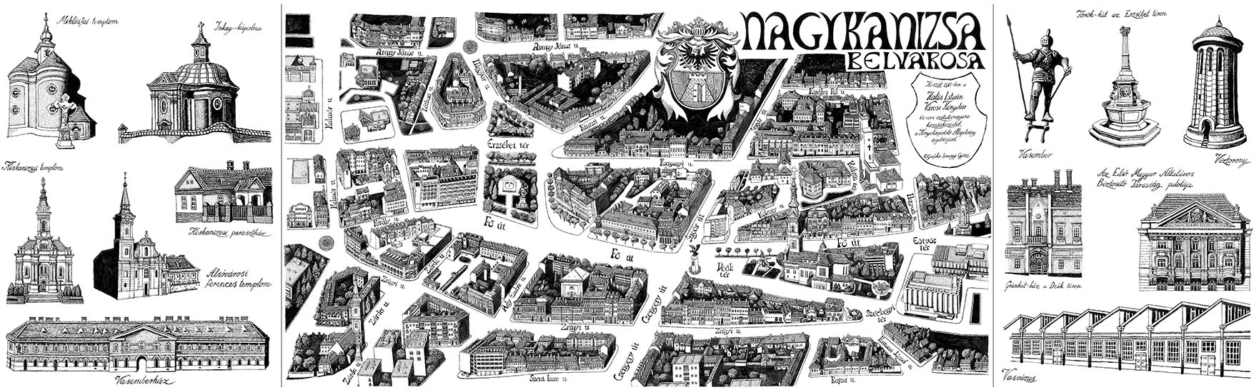 Nyilvános 2461 | 9106 | Nagykanizsa belvárosa madártávlati képe - Somogyi Győző alkotása - nagy méretben megtekinthető a könyvtárban, kis méretben meg is vásárolható a könyvtártól: | A 30x100 cm-es Nagykanizsa belvárosa madártávlati kép érvényes olvasói tagsággal rendelkezők számára 200 Ft-ba kerül, egyébként 300 Ft, fóliázott változatban 600 Ft (olvasóinknak 500 Ft). |
