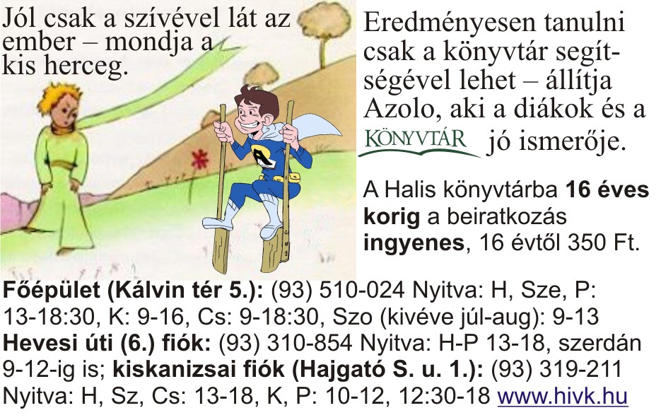 Nyilvános 1484 | 3003 | Jól csak a szívével lát az ember – mondja a kis herceg. | Eredményesen tanulni csak a könyvtár segítségével lehet – állítja Azolo, aki a diákok és a könyvtár jó ismerője. A Halis könyvtárba 16 éves korig a beiratkozás ingyenes, 16 évtől 350 Ft. Főépület (Kálvin tér 5.): (93) 510-024 Nyitva: H, Sze, P: 13-18:30, K: 9-16, Cs: 9-18:30, Szo (kivéve júl-aug): 9-13 Hevesi úti (6.) fiók: (93) 310-854 Nyitva: H-P 13-18, szerdán 9-12-ig is; kiskanizsai fiók (Hajgató S. u. 1.): (93) 319-211 Nyitva: H, Sz, Cs: 13-18, K, P: 10-12, 12:30-18 www.hivk.hu |