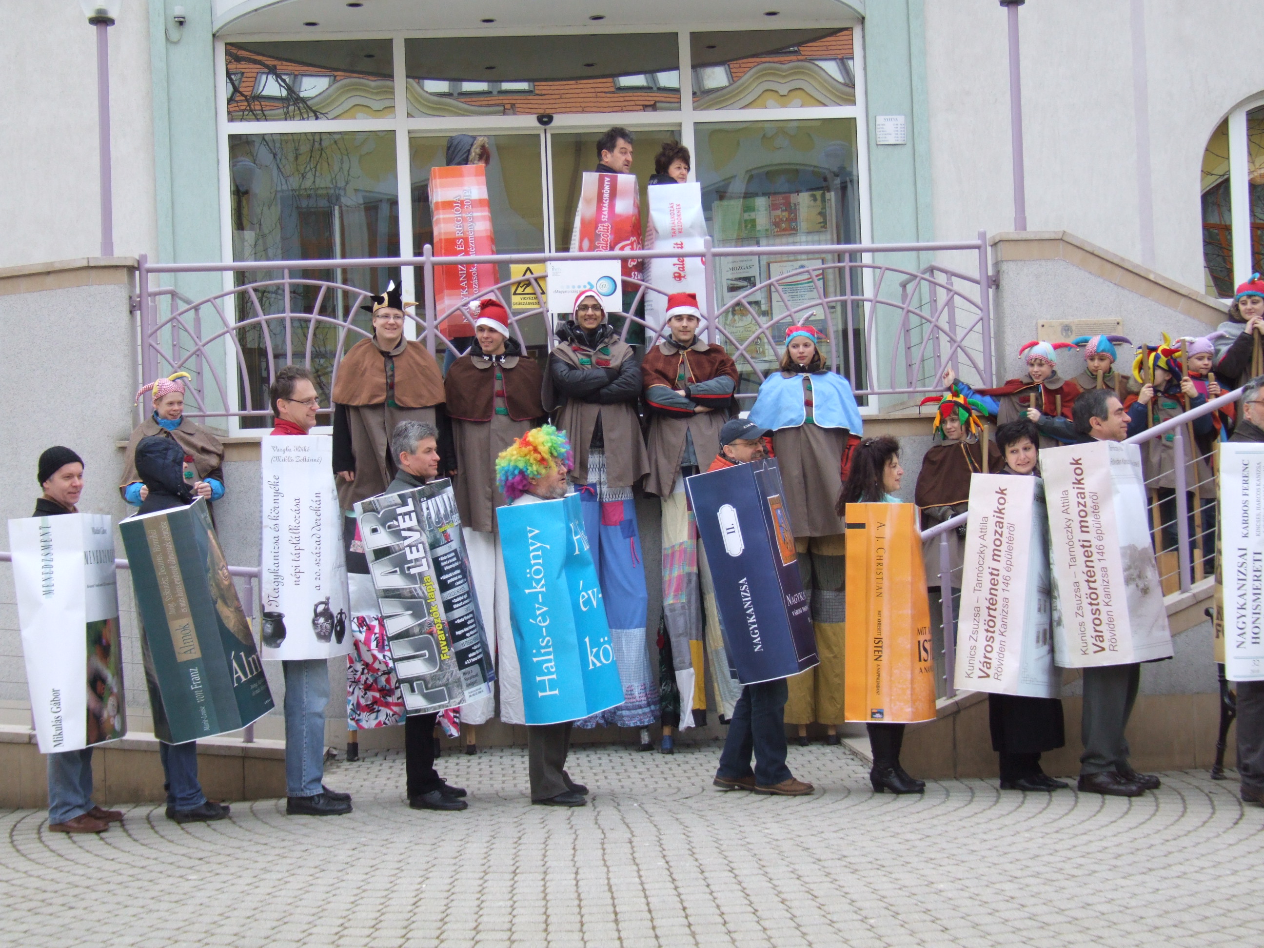 Nyilvános 1869 | 3563 | 2013. február 9. A farsangi fánkfesztiválra készülve felhívásban kértük olvasóinkat, hogy öltsék magukra kedves könyvüket. Egy „könyvespolcnyi” jelentkező vette magára kedves olvasmányát, az ő vonulásukról készültek ezek a képek. A környezetükben néhol láthatók a Nagykanizsai Gólyalábasok, akik szintén a könyvtárhoz kötődnek. A „felvonuló kötetek” a könyvtár épületében még megtekinthetők. | |