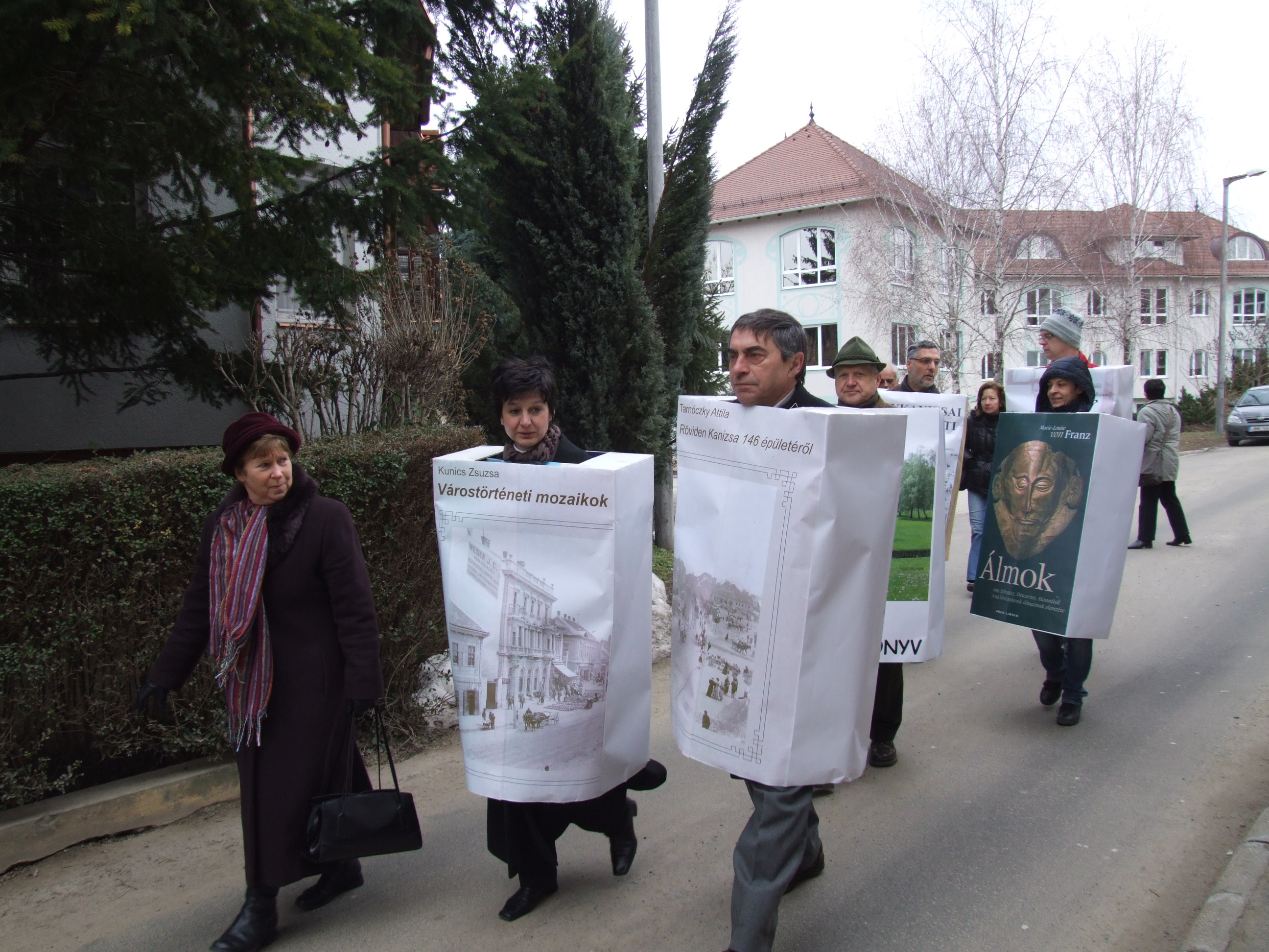 Nyilvános 1860 | 3451 | 2013. február 9. A farsangi fánkfesztiválra készülve felhívásban kértük olvasóinkat, hogy öltsék magukra kedves könyvüket. Egy „könyvespolcnyi” jelentkező vette magára kedves olvasmányát, az ő vonulásukról készültek ezek a képek. A környezetükben néhol láthatók a Nagykanizsai Gólyalábasok, akik szintén a könyvtárhoz kötődnek. A „felvonuló kötetek” a könyvtár épületében még megtekinthetők. | |