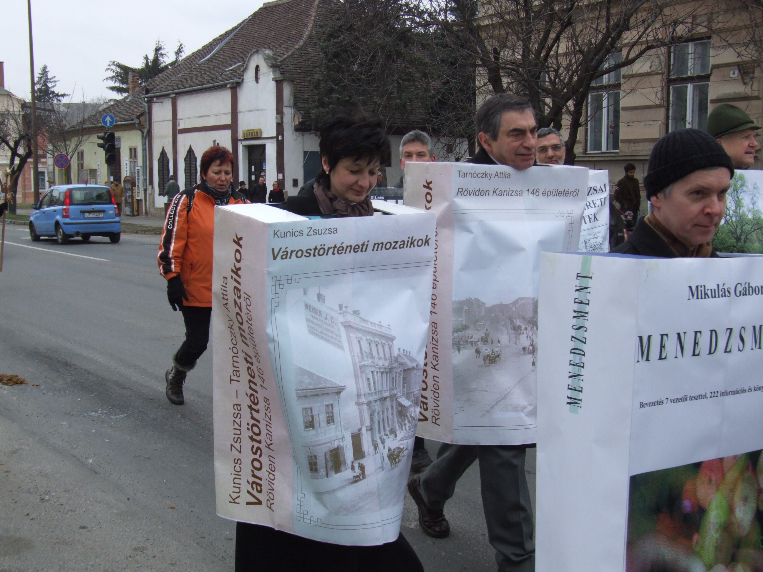 Nyilvános 1378 | 1672 | 2013. február 9. A farsangi fánkfesztiválra készülve felhívásban kértük olvasóinkat, hogy öltsék magukra kedves könyvüket. Egy „könyvespolcnyi” jelentkező vette magára kedves olvasmányát, az ő vonulásukról készültek ezek a képek. A környezetükben néhol láthatók a Nagykanizsai Gólyalábasok, akik szintén a könyvtárhoz kötődnek. A „felvonuló kötetek” a könyvtár épületében még megtekinthetők. | |