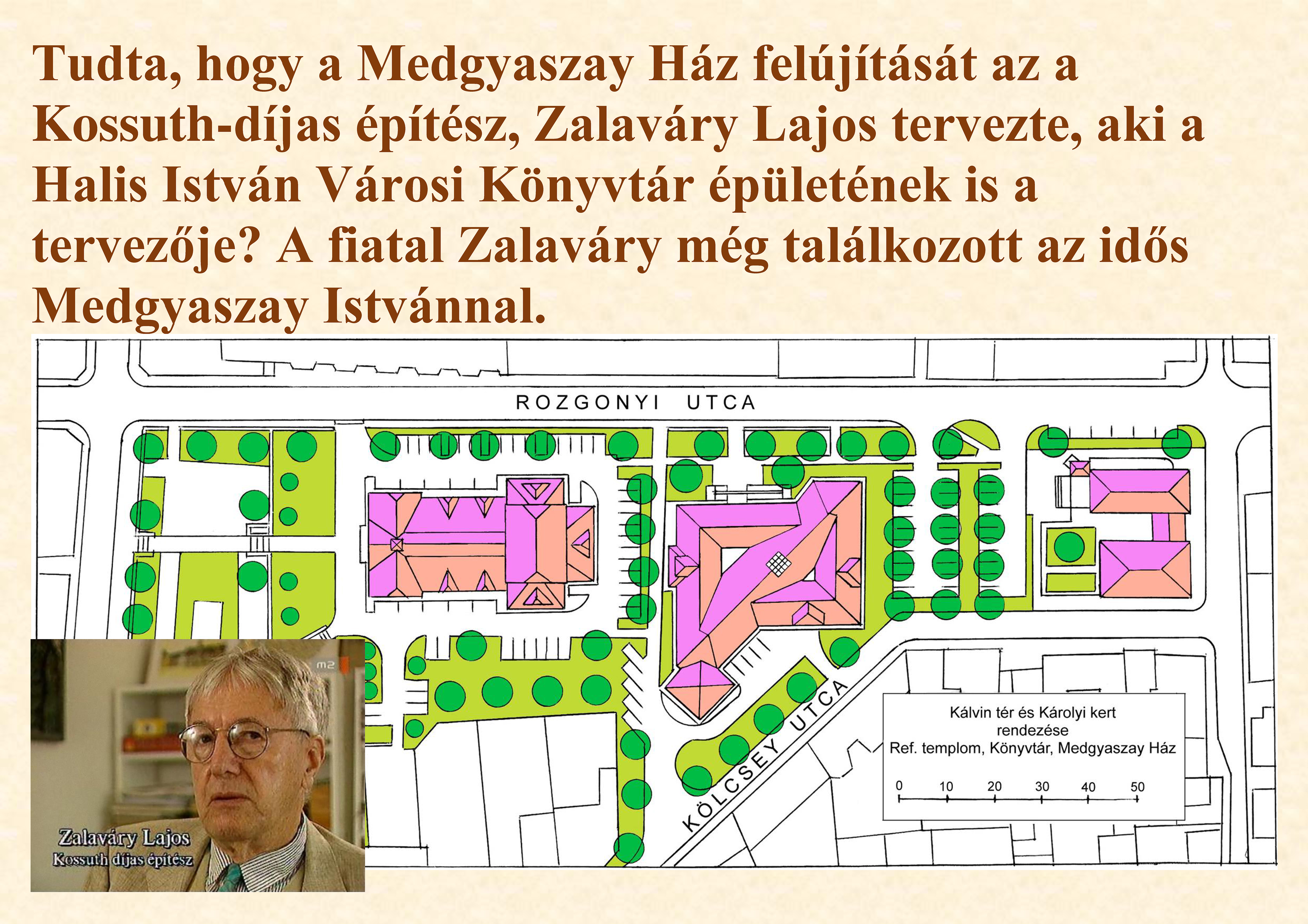 Nyilvános 1606 | 2711 | Tudta, hogy a Medgyaszay Ház felújítását az a Kossuth-díjas építész, Zalaváry Lajos tervezte, aki a Halis István Városi Könyvtár épületének is a tervezője? A fiatal Zalaváry még találkozott az idős Medgyaszay Istvánnal. | |