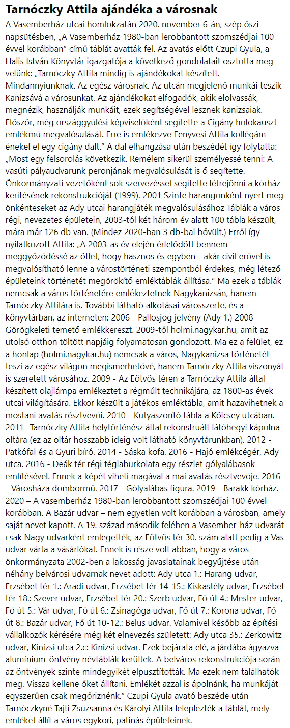 Nyilvános 1662 | 2467 | Tarnóczky Attila ajándéka a városnak | A Vasemberház utcai homlokzatán 2020. november 6-án, szép őszi napsütésben, „A Vasemberház 1980-ban lerobbantott szomszédjai 100 évvel korábban” című táblát avatták fel. Az avatás előtt Czupi Gyula, a Halis István Könyvtár igazgatója a következő gondolatait osztotta meg velünk: „Tarnóczky Attila mindig is ajándékokat készített. Mindannyiunknak. Az egész városnak. Az utcán megjelenő munkái teszik Kanizsává a városunkat. Az ajándékokat elfogadók, akik elolvassák, megnézik, használják munkáit, ezek segítségével lesznek kanizsaiak. Először, még országgyűlési képviselőként segítette a Cigány holokauszt emlékmű megvalósulását. Erre is emlékezve Fenyvesi Attila kollégám énekel el egy cigány dalt.” A dal elhangzása után beszédét így folytatta: „Most egy felsorolás következik. Remélem sikerül személyessé tenni: A vasúti pályaudvarunk peronjának megvalósulását is ő segítette. Önkormányzati vezetőként sok szervezéssel segítette létrejönni a kórház kerítésének rekonstrukcióját (1999). 2001 Szinte harangonként nyert meg önkénteseket az Ady utcai harangjáték megvalósulásához Táblák a város régi, nevezetes épületein, 2003-tól két három év alatt 100 tábla készült, mára már 126 db van. (Mindez 2020-ban 3 db-bal bővült.) Erről így nyilatkozott Attila: „A 2003-as év elején érlelődött bennem meggyőződéssé az ötlet, hogy hasznos és egyben - akár civil erővel is - megvalósítható lenne a várostörténeti szempontból érdekes, még létező épületeink történetét megörökítő emléktáblák állítása.” Ma ezek a táblák nemcsak a város történetére emlékeztetnek Nagykanizsán, hanem Tarnóczky Attilára is. További látható alkotásai városszerte, és a könyvtárban, az interneten: 2006 - Pallosjog jelvény (Ady 1.) 2008 - Görögkeleti temető emlékkereszt. 2009-től holmi.nagykar.hu, amit az utolsó otthon töltött napjáig folyamatosan gondozott. Ma ez a felület, ez a honlap (holmi.nagykar.hu) nemcsak a város, Nagykanizsa történetét teszi az egész világon megismerhetővé, hanem Tarnóczky Attila viszonyát is szeretett városához. 2009 - Az Eötvös téren a Tarnóczky Attila által készített olajlámpa emlékeztet a régmúlt technikájára, az 1800-as évek utcai világítására. Ekkor készült a játékos emléktábla, amit hazavihetnek a mostani avatás résztvevői. 2010 - Kutyaszorító tábla a Kölcsey utcában. 2011- Tarnóczky Attila helytörténész által rekonstruált látóhegyi kápolna oltára (ez az oltár hosszabb ideig volt látható könyvtárunkban). 2012 - Patkófal és a Gyuri bíró. 2014 - Sáska kofa. 2016 - Hajó emlékcégér, Ady utca. 2016 - Deák tér régi téglaburkolata egy részlet gólyalábasok említésével. Ennek a képét viheti magával a mai avatás résztvevője. 2016 - Városháza dombormű. 2017 - Gólyalábas figura. 2019 - Barakk kórház. 2020 – A vasemberház 1980-ban lerobbantott szomszédjai 100 évvel korábban. A Bazár udvar – nem egyetlen volt korábban a városban, amely saját nevet kapott. A 19. század második felében a Vasember-ház udvarát csak Nagy udvarként emlegették, az Eötvös tér 30. szám alatt pedig a Vas udvar várta a vásárlókat. Ennek is része volt abban, hogy a város önkormányzata 2002-ben a lakosság javaslatainak begyűjtése után néhány belvárosi udvarnak nevet adott: Ady utca 1.: Harang udvar, Erzsébet tér 1.: Aradi udvar, Erzsébet tér 14-15.: Kiskastély udvar, Erzsébet tér 18.: Szever udvar, Erzsébet tér 20.: Szerb udvar, Fő út 4.: Mester udvar, Fő út 5.: Vár udvar, Fő út 6.: Zsinagóga udvar, Fő út 7.: Korona udvar, Fő út 8.: Bazár udvar, Fő út 10-12.: Belus udvar. Valamivel később az építési vállalkozók kérésére még két elnevezés született: Ady utca 35.: Zerkowitz udvar, Kinizsi utca 2.c: Kinizsi udvar. Ezek bejárata elé, a járdába ágyazva alumínium-öntvény névtáblák kerültek. A belváros rekonstrukciója során az öntvények szinte mindegyikét elpusztították. Ma ezek nem találhatók meg. Vissza kellene őket állítani. Emlékét azzal is ápolnánk, ha munkáját egyszerűen csak megőriznénk.” Czupi Gyula avató beszéde után Tarnóczkyné Tajti Zsuzsanna és Károlyi Attila leleplezték a táblát, mely emléket állít a város egykori, patinás épületeinek. |