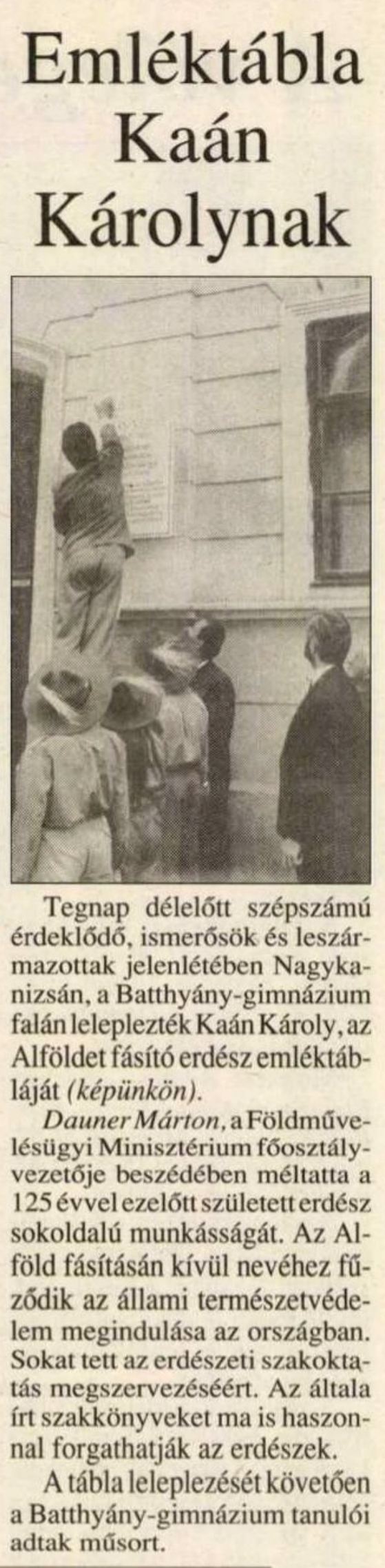 Nyilvános 1686 | 2489 | Zalai Hírlap 1992. május 23. 16. oldal | Emléktábla Kaán Károlynak Tegnap délelőtt szépszámú érdeklődő, ismerősök és leszármazottak jelenlétében Nagykanizsán, a Batthyány-gimnázium falán leleplezték Kaán Károly, az Alföldet fásító erdész emléktábláját (képünkön). Dauner Márton, a Földművelésügyi Minisztérium főosztályvezetője beszédében méltatta a 125 évvel ezelőtt született erdész sokoldalú munkásságát. Az Alföld fásításán kívül nevéhez fűződik az állami természetvédelem megindulása az országban. Sokat tett az erdészeti szakoktatás megszervezéséért. Az általa írt szakkönyveket ma is haszonnal forgathatják az erdészek. A tábla leleplezését követően a Batthyány-gimnázium tanulói adtak műsort. |