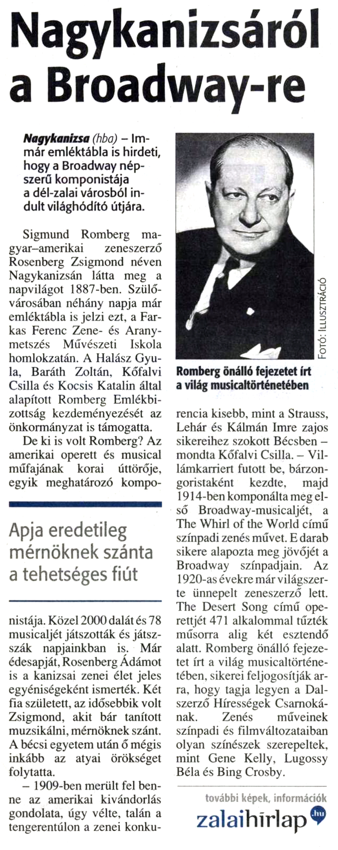 Nyilvános 1317 | 1496 | Zalai Hírlap 2010. október 1. 7. oldal | Nagykanizsáról a Broadway-re Nagykanizsa (hba) - Immár emléktábla is hirdeti, hogy a Broadway népszerű komponistája a dél-zalai városból indult világhódító útjára. Sigmund Romberg magyar-amerikai zeneszerző Rosenberg Zsigmond néven Nagykanizsán látta meg a napvilágot 1887-ben. Szülővárosában néhány napja már emléktábla is jelzi ezt, a Farkas Ferenc Zene- és Aranymetszés Művészeti Iskola homlokzatán. A Halász Gyula, Baráth Zoltán, Kőfalvi Csilla és Kocsis Katalin által alapított Romberg Emlékbizottság kezdeményezését az önkormányzat is támogatta. De ki is volt Romberg? Az amerikai operett és musical műfajának korai úttörője, egyik meghatározó komponistája. Közel 2000 dalát és 78 musicaljét játszották és játsszák napjainkban is. Már édesapját, Rosenberg Ádámot is a kanizsai zenei élet jeles egyéniségeként ismerték. Két fia született, az idősebbik volt Zsigmond, akit bár tanított muzsikálni, mérnöknek szánt. A bécsi egyetem után ő mégis inkább az atyai örökséget folytatta. - 1909-ben merült fel benne az amerikai kivándorlás gondolata, úgy vélte, talán a tengerentúlon a zenei konkurencia kisebb, mint a Strauss, Lehár és Kálmán Imre zajos sikereihez szokott Bécsben - mondta Kőfalvi Csilla. - Villámkarriert futott be, bárzongoristaként kezdte, majd 1914-ben komponálta meg első Broadway-musicaljét, a The Whirl of the World című színpadi zenés művet. E darab sikere alapozta meg jövőjét a Broadway színpadjain. Az 1920-as évekre már világszerte ünnepelt zeneszerző lett. The Desert Song című operettjét 471 alkalommal tűzték műsorra alig két esztendő alatt. Romberg önálló fejezetet írt a világ musicaltörténetében, sikerei feljogosítják arra, hogy tagja legyen a Dalszerző Hírességek Csarnokának. Zenés műveinek színpadi és filmváltozataiban olyan színészek szerepeltek, mint Gene Kelly, Lugossy Béla és Bing Crosby. Romberg önálló fejezetet írt a világ musicaltörténetében |