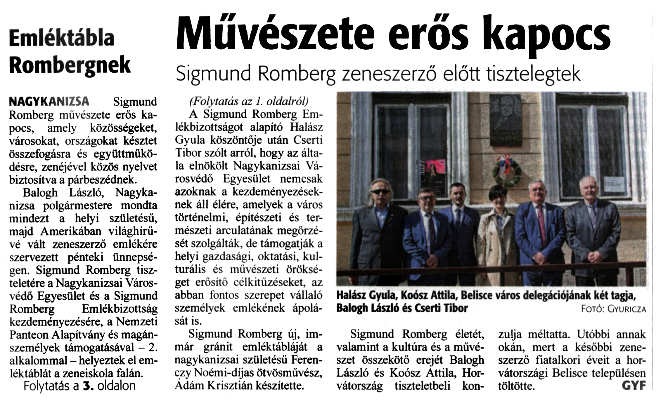 Nyilvános 1361 | 1686 | Zalai Hírlap 2023. március 25. 1, 3. oldal | Emléktábla Rombergnek NAGYKANIZSA Sigmund Romberg művészete erős kapocs, amely közösségeket, városokat, országokat késztet összefogásra és együttműködésre, zenéjével közös nyelvet biztosítva a párbeszédnek. Balogh László, Nagykanizsa polgármestere mondta mindezt a helyi születésű, majd Amerikában világhírűvé vált zeneszerző emlékére szervezett pénteki ünnepségen. Sigmund Romberg tiszteletére a Nagykanizsai Városvédő Egyesület és a Sigmund Romberg Emlékbizottság kezdeményezésére, a Nemzeti Panteon Alapítvány és magánszemélyek támogatásával - 2. alkalommal - helyeztek el emléktáblát a zeneiskola falán. A Sigmund Romberg Emlékbizottságot alapító Halász Gyula köszöntője után Cserti Tibor szólt arról, hogy az általa elnökölt Nagykanizsai Városvédő Egyesület nemcsak azoknak a kezdeményezéseknek áll élére, amelyek a város történelmi, építészeti és természeti arculatának megőrzését szolgálták, de támogatják a helyi gazdasági, oktatási, kulturális és művészeti örökséget erősítő célkitűzéseket, az abban fontos szerepet vállaló személyek emlékének ápolását is. Sigmund Romberg új, immár gránit emléktábláját a nagykanizsai születésű Ferenczy Noémi-díjas ötvösművész, Ádám Krisztián készítette. Sigmund Romberg életét, valamint a kultúra és a művészet összekötő erejét Balogh László és Koósz Attila, Horvátország tiszteletbeli kon- zulja méltatta. Utóbbi annak okán, mert a későbbi zeneszerző fiatalkori éveit a horvátországi Belisce településen töltötte. CYF Halász Gyula, Koósz Attila, Belisce város delegációjának két tagja, Balogh László és Cserti Tibor Fotó: Gyuricza |